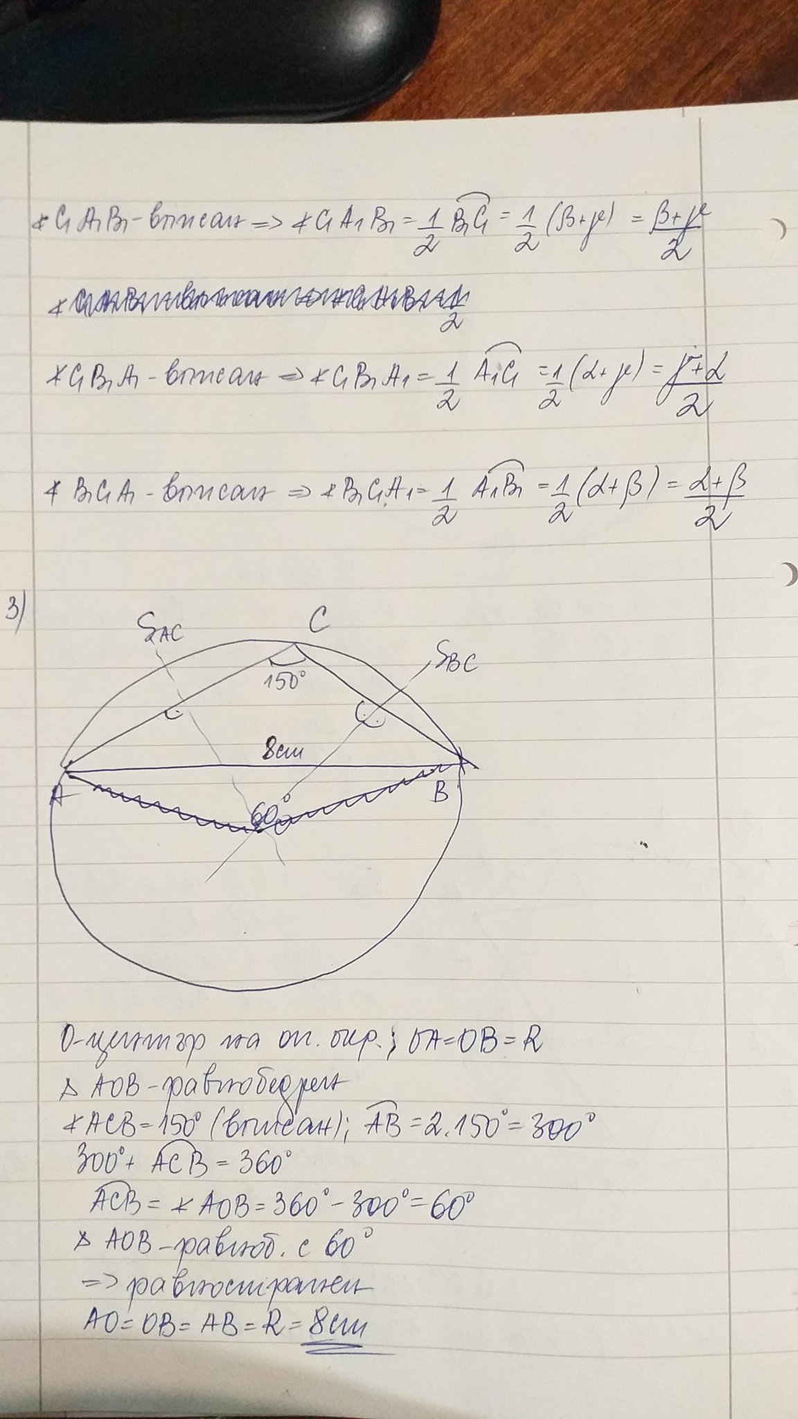 3)Един от ъглите на равнобедрен  триъг. е 150 градуса, а основата му има дължина 8 см. Намерете радиуса на описаната около него окръжност.