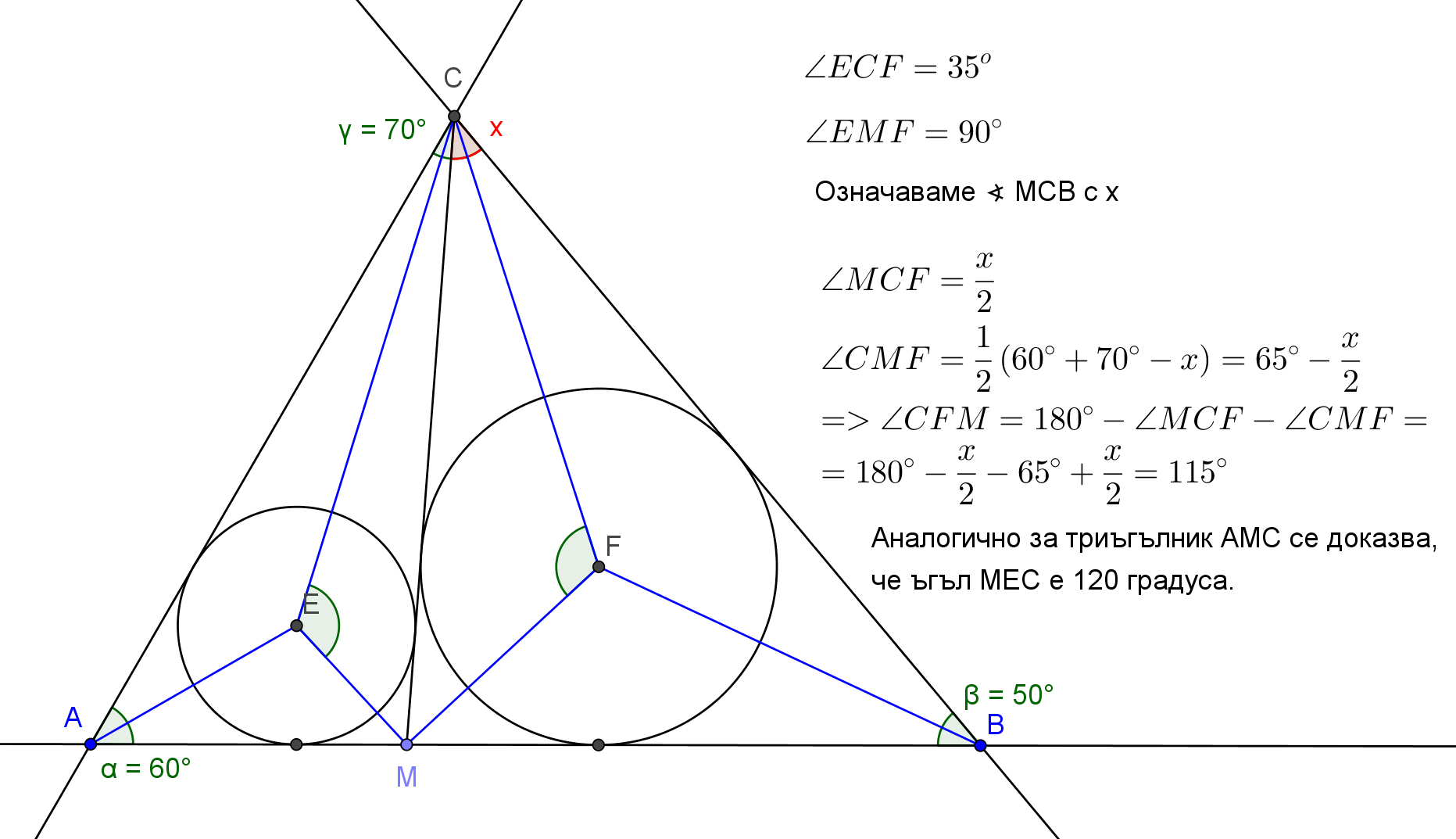 1. В триъгълник АВС ъгъл АВС е 50 градуса и ВАС е 60 градуса. Точка М е от страната АВ. Точките E и F са центровете на окръжностите вписани съответно в триъгълник АМС и ВМС. Намерете ъглите на четириъгълника CEMF.