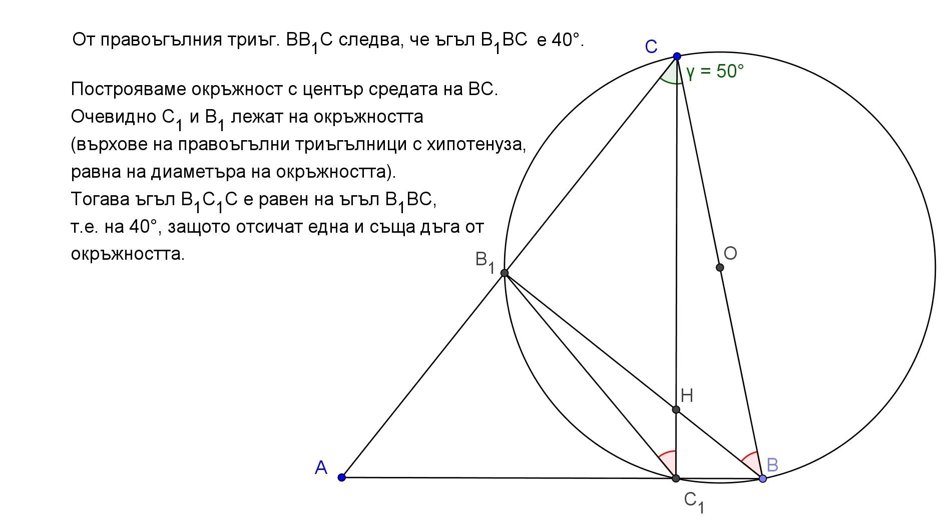 Даден е остроъгълен триъгълник АВС с височини ВВ1 и СС1, ортоцентър Н и ъгъл АСВ 50 градуса. Намерете ъгъл НС1В1.