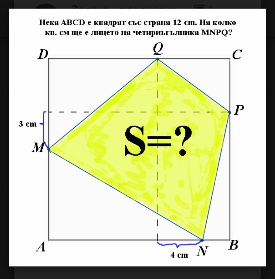Лицето на MNPQ е равно на лицето на квадрата ABCD 144см минус лицата на правоъгълните триъгълници PCQ, QDM, MAN и NBP.