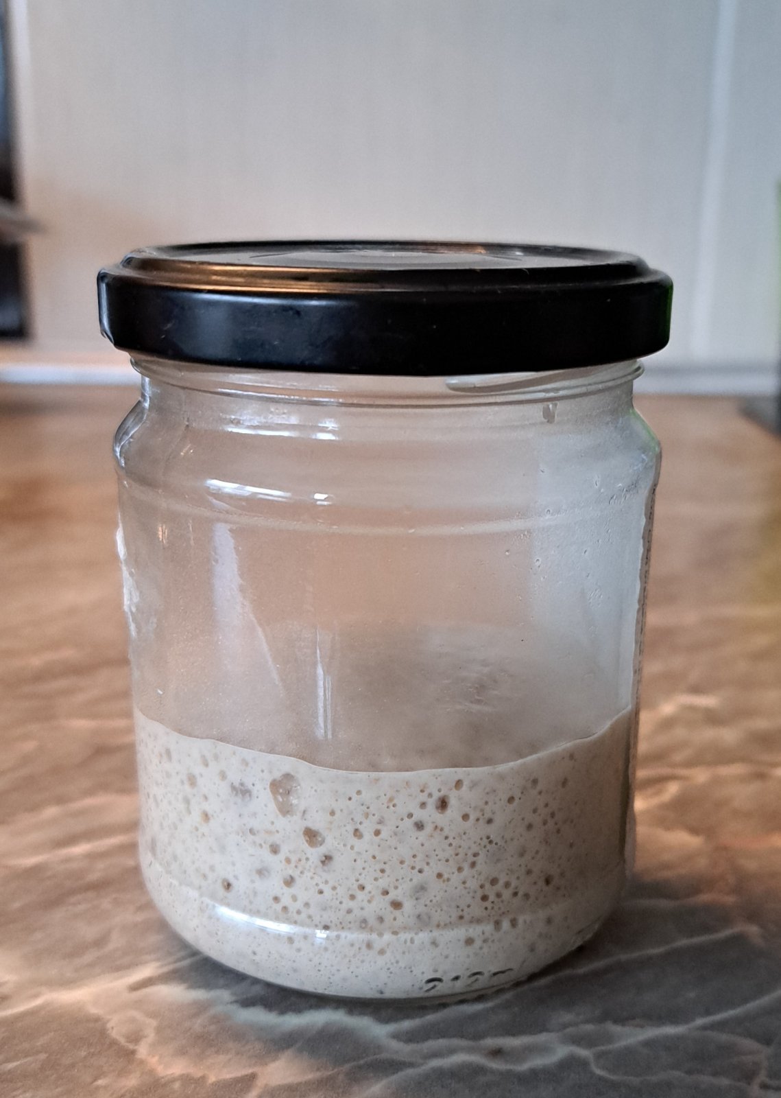 Сутринта като го заредих беше под чертата на бурканчето (не мога да задържа ластика там), за нула време се удвои и го прибрах в хладилника, сега го поглеждам и е тройно. Simple Smile   По 10г ми е всичко - квас, брашно и вода.
