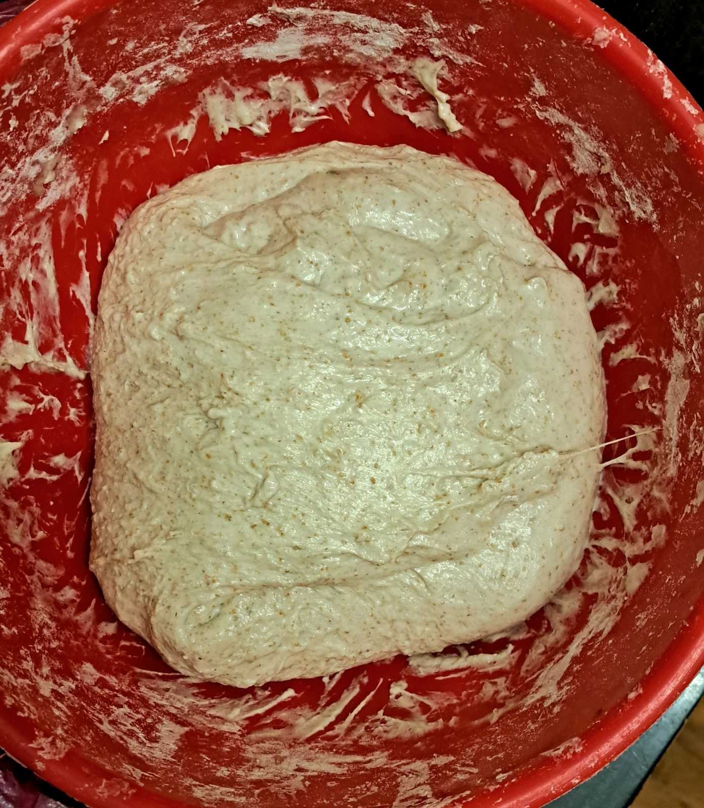 Туй то, захванах се само с остатъчен квас и това е след първото сгъване, сгъвам още 3 пъти и си лягам, а тестото в една тенджера  и на балкона ще спи.  Автолиза 1.50ч.