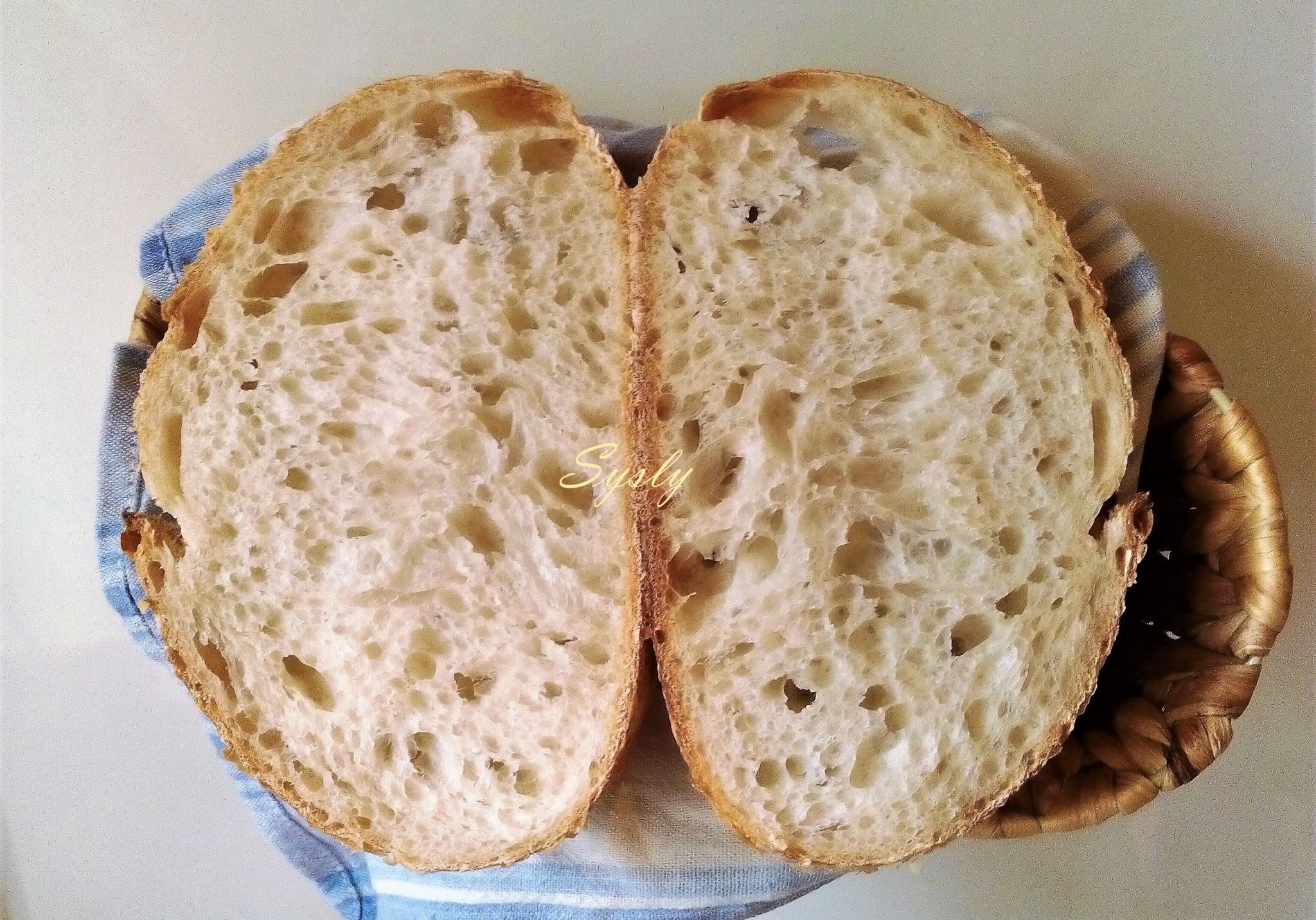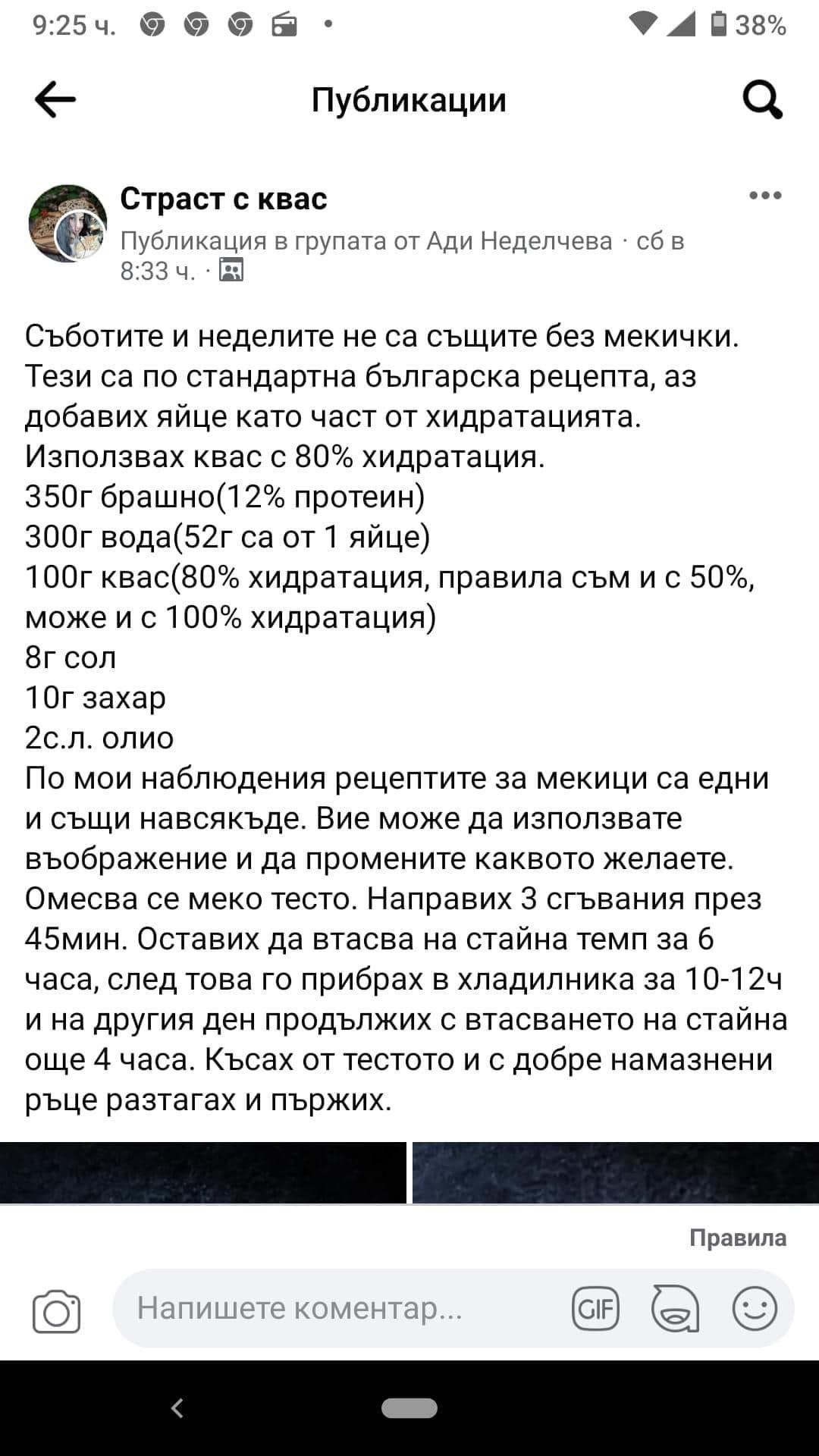 Та ей ми последното хлебче (5тото)  снощи го пекох.  Забърках го пак като тостерен (по спешност, че този вчерашния свърши без време ) и в рамките на деня стана, но си правих всичките сгъвки, та някакъв хибрид излезе. 🙂  С повече ръжено брашно е, иначе пак съм доволна, ама ми е резервен вариант де (тостерния хляб), не ми харесва толкоз бърз.  Сутринта забърках за Автолизата 300г бяло брашно (13.4г белтък) и 100г ръжено Екосем с  около 300г вода ( към 78% хидратация) и оставих за 30 мин.  - беше достатъчно. Добавих 150г квас в пик  смесих и оставих за 30мин.  Добавих 2%  (8г) сол и измесих  по метода slap & fold - почивка 45мин.  Сгънах, почивка 30мин, ламинирах и после още 4 сгъвки през 40мин.  и оставих да втасва.  Та насипната ферментация - 6.,30часа, а ретардация - 3часа.