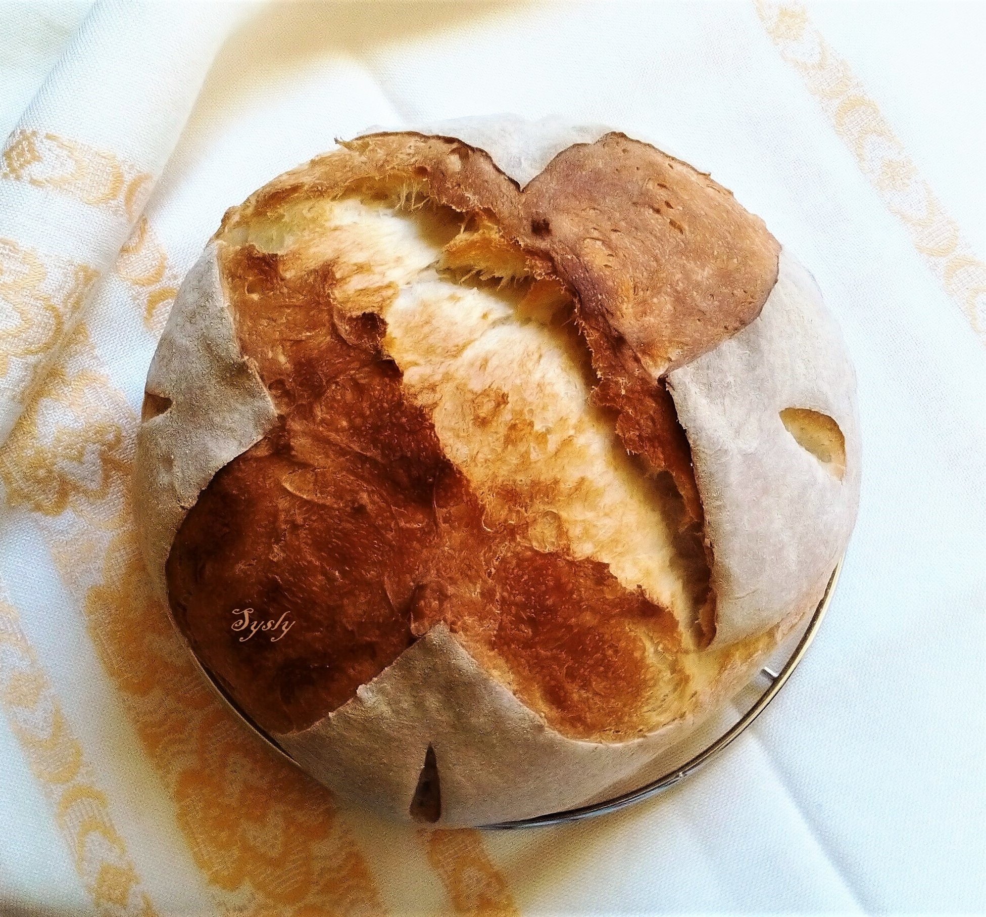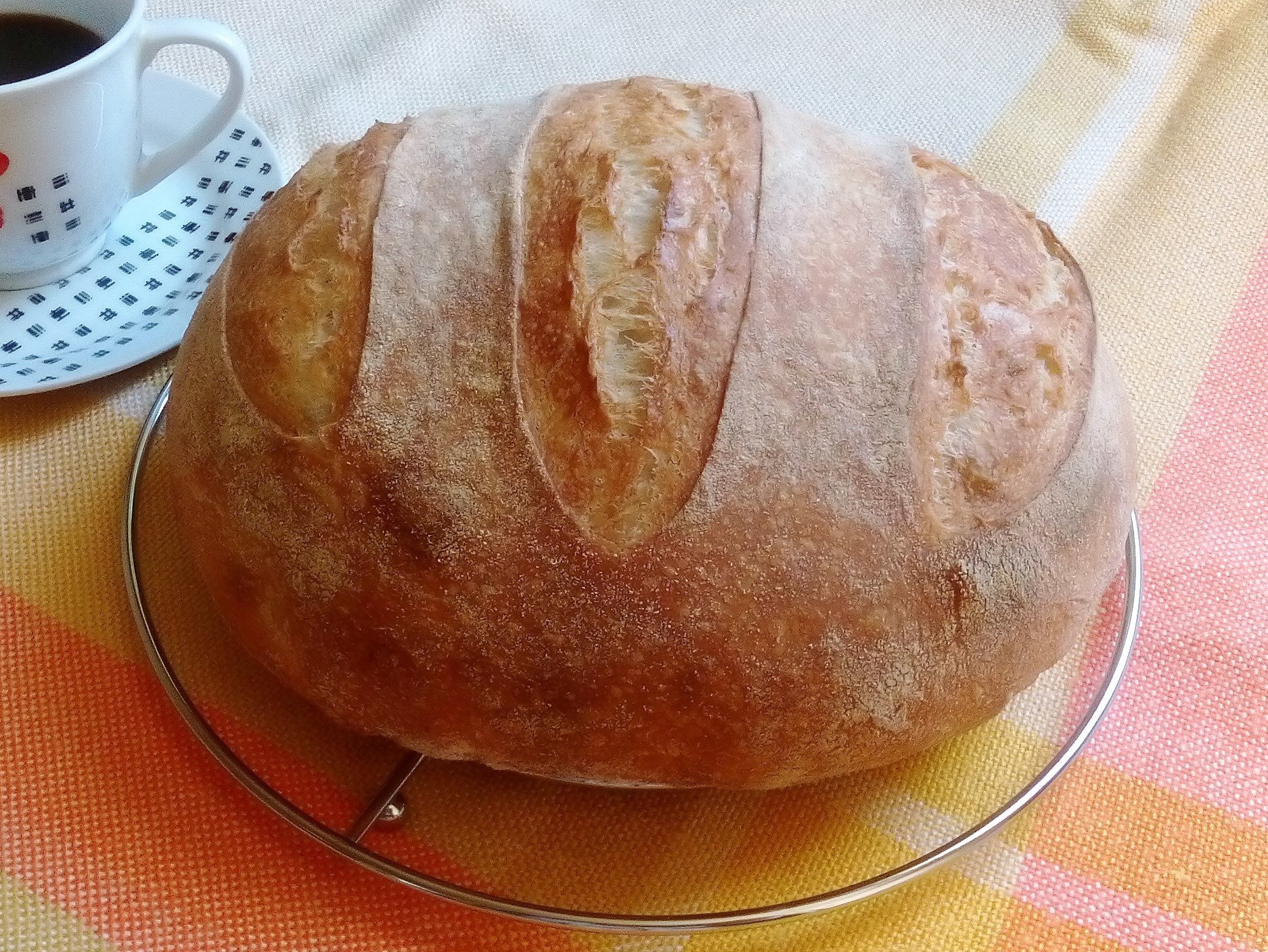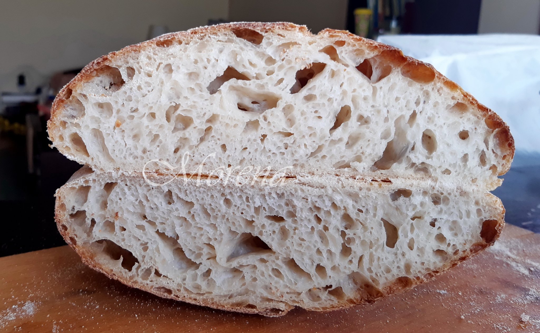 Сутринта 6.30 смесвам квас и тестото, 7.00 добавям сол, 7.30 мокря плота и изсипвам тестото с мокри ръце, изтеглям като кора за баница, прегъвам и пак в купата; 8.00 прегъвания с мокри ръце в купата, 8.30 набрашнен плот -изсипвам тестото, оформям, набрашнявам хартия за печене, слагам тестото и в йенската тенджера(и фолирам отгоре), прибирам в хладилника, че излизам за работа. Вечерта 23.00 изкарвам тестото на стайна температура. Сутринта загрявам фурната само с йенската тенджера (с хартията прехвърлям тестото в подобна форма ) и после пека.