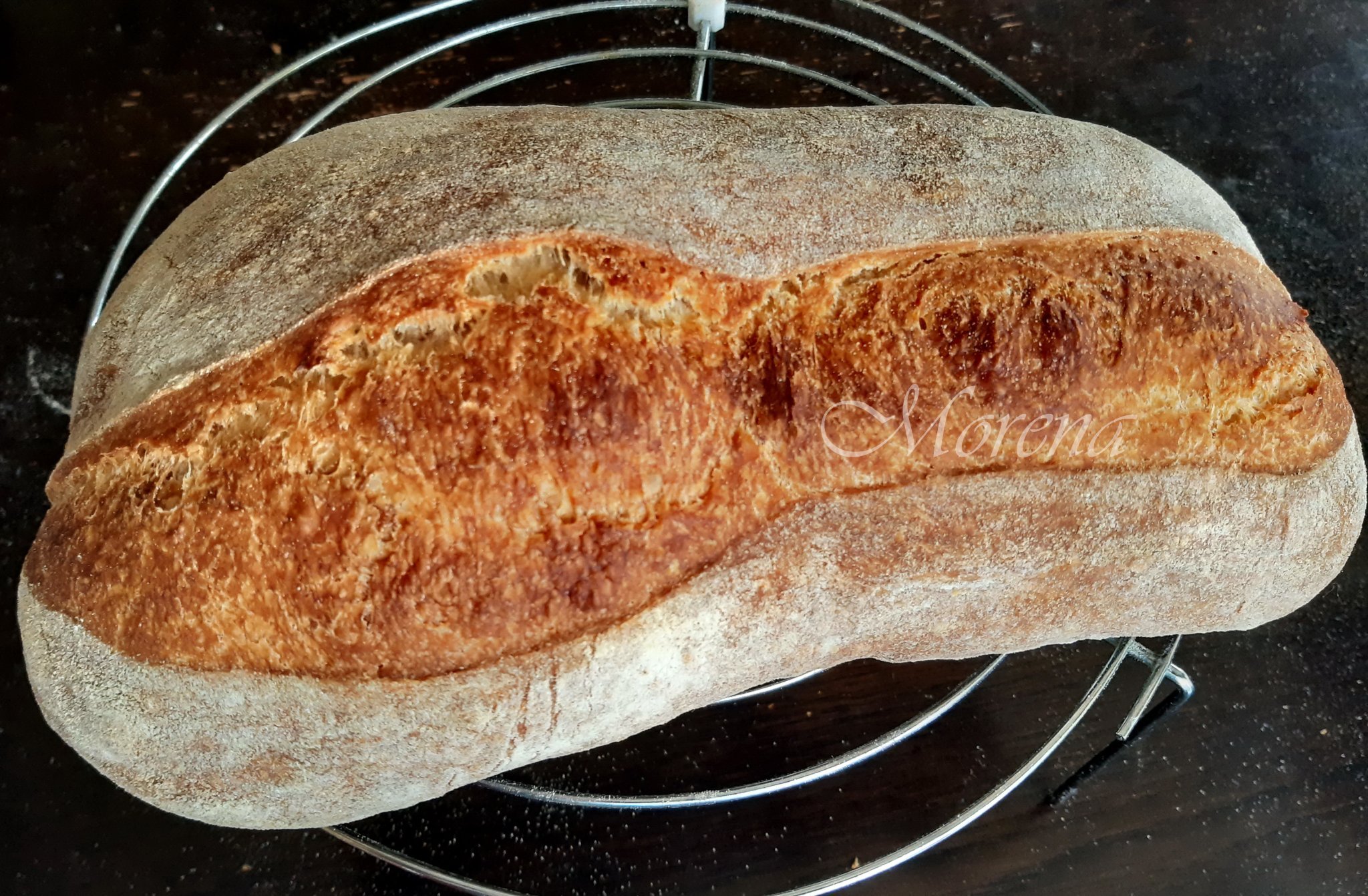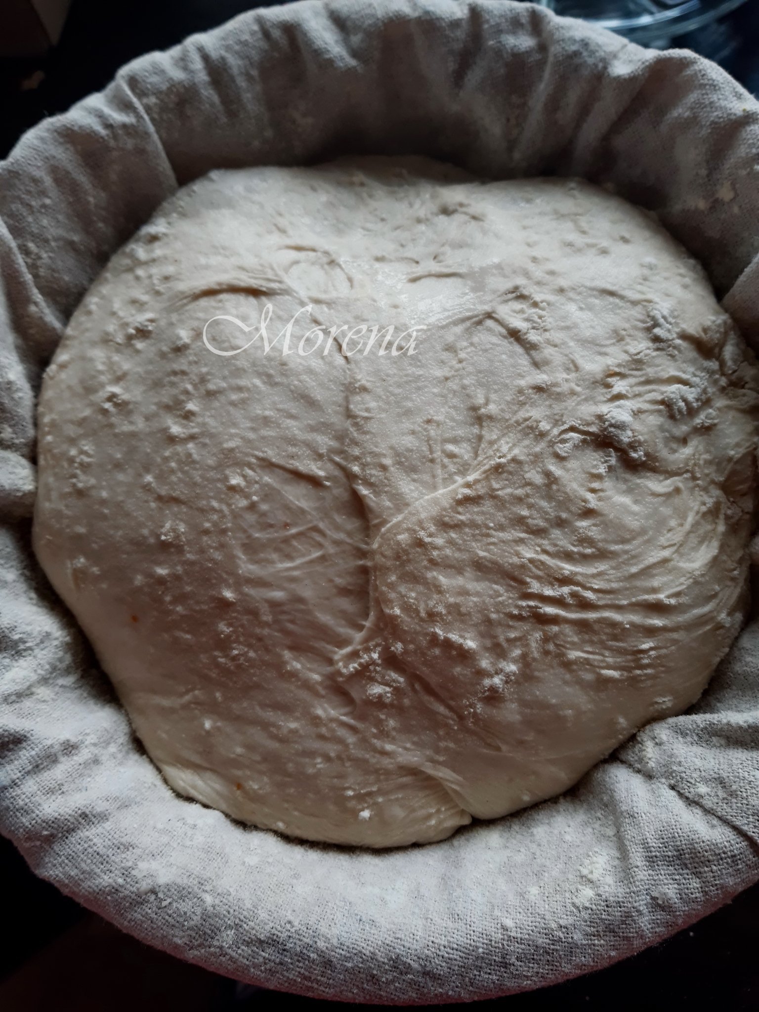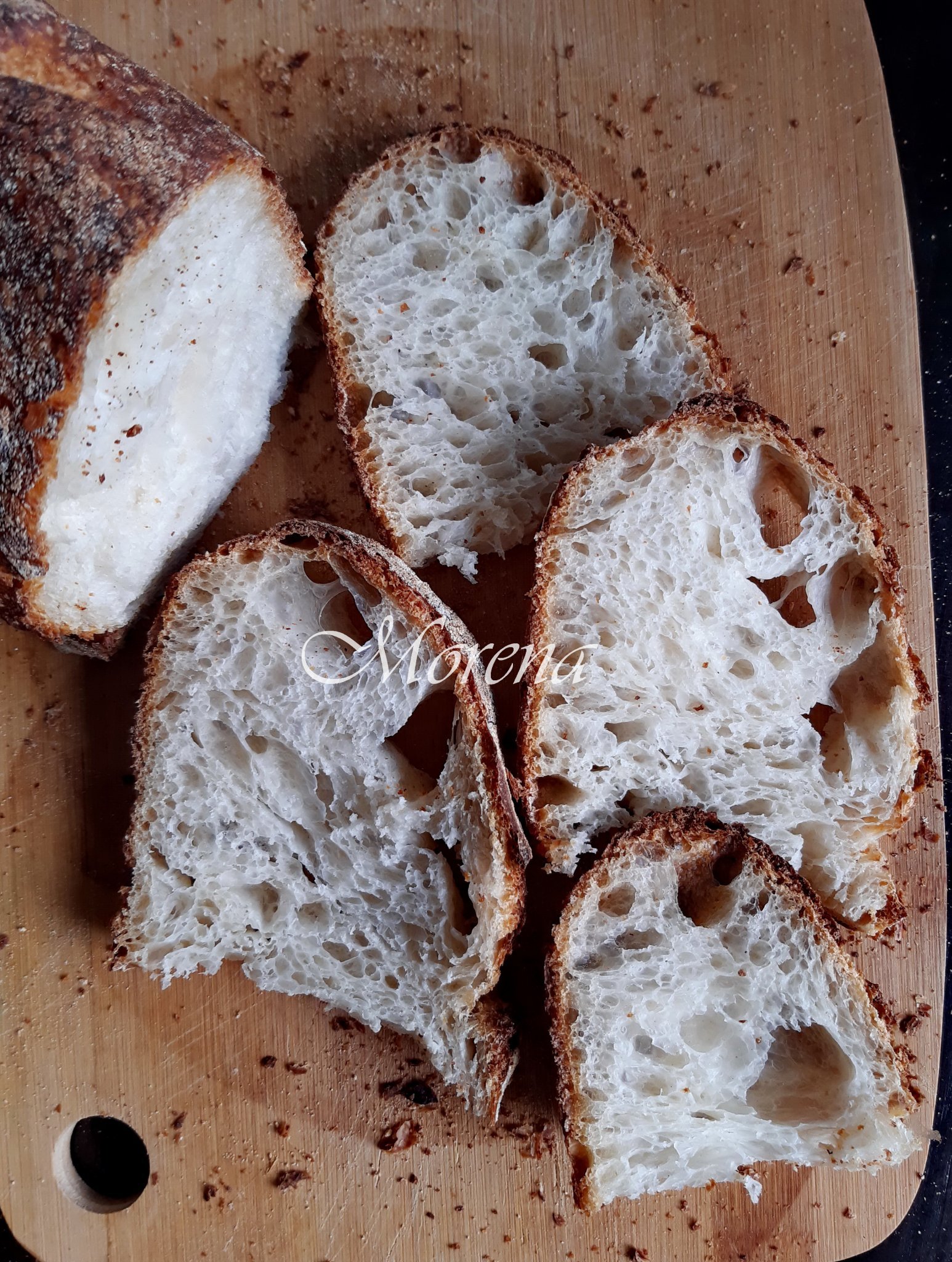 Стъпките са 1. Автолиза 40-60мин 2. Добавяне на кваса 3. След 30мин. добавяне на солта и измесване 4. След 30мин. разтягане и сгъване 5. След 45 мин. ламиниране 6. 3-4 разтягания и сгъвания пре 30-40мин. 7. Втасване на стайна Т почти ди удвояване 8. оформяне и поставяне в съда за втасване и в хладилника за 12-16 часа; 9. Печене 10. Изстиване.