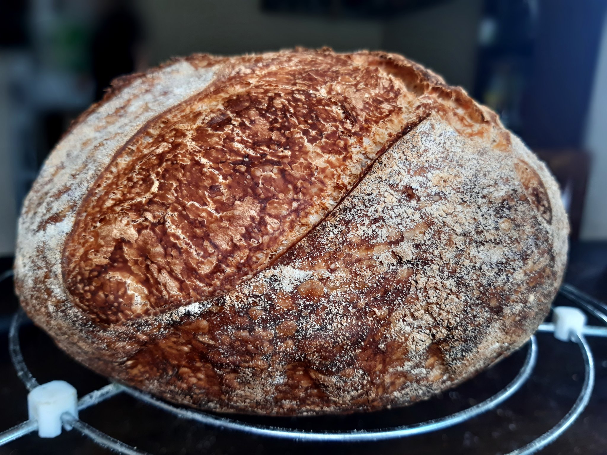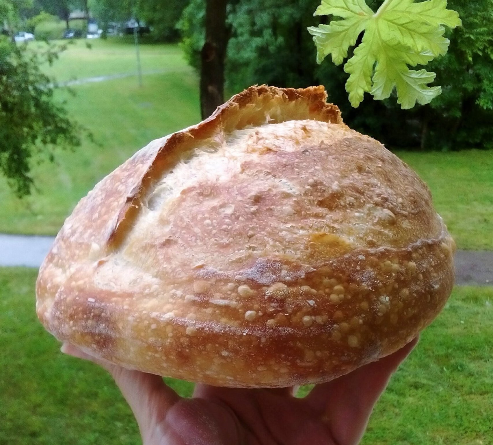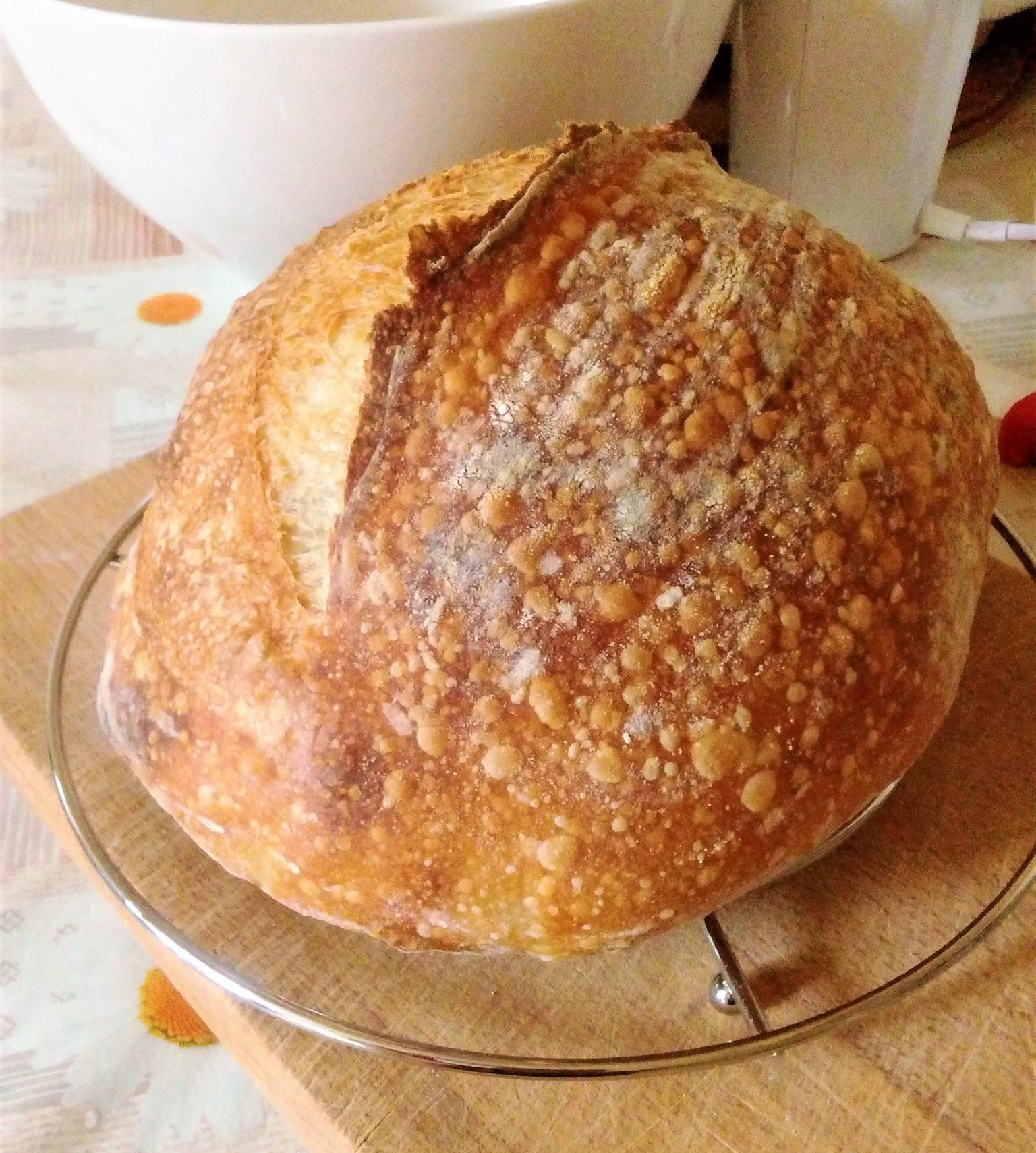 Стъпките са 1. Автолиза 40-60мин 2. Добавяне на кваса 3. След 30мин. добавяне на солта и измесване 4. След 30мин. разтягане и сгъване 5. След 45 мин. ламиниране 6. 3-4 разтягания и сгъвания пре 30-40мин. 7. Втасване на стайна Т почти ди удвояване 8. оформяне и поставяне в съда за втасване и в хладилника за 12-16 часа; 9. Печене 10. Изстиване.