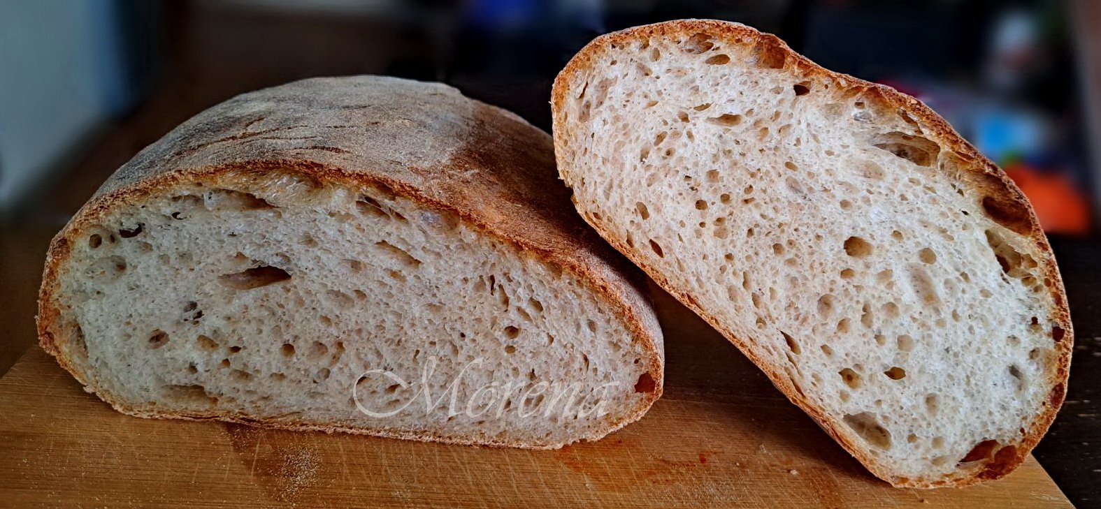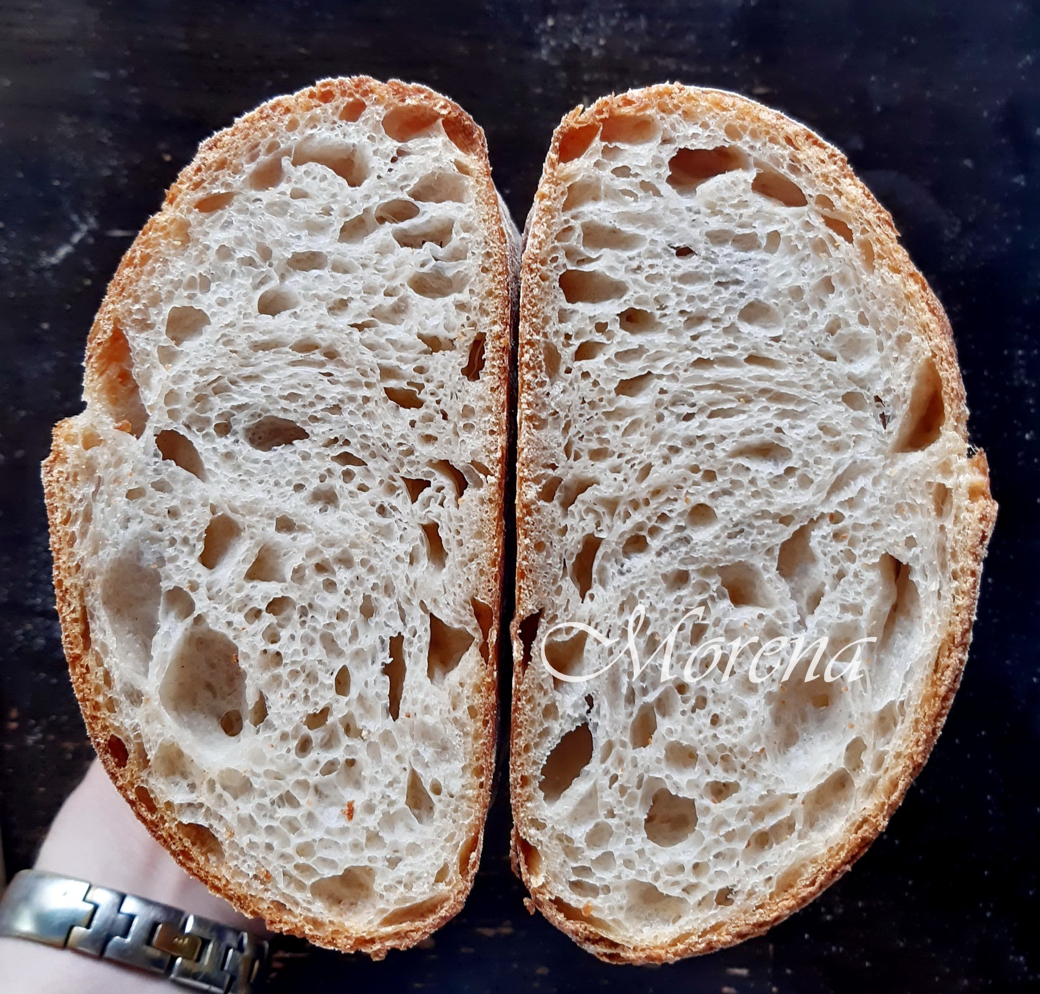 Там е работата... тъкмо това се опитвам да открия.  Подозирам сгъванията и най вече престоя в хладилник.  За сега най-близо до маяния хляб (с крекки кора и среда) са хлябовете с две топли ферментации. Като един правих по примера  на тостерния със сгъвания, а другия е без сгъвания.