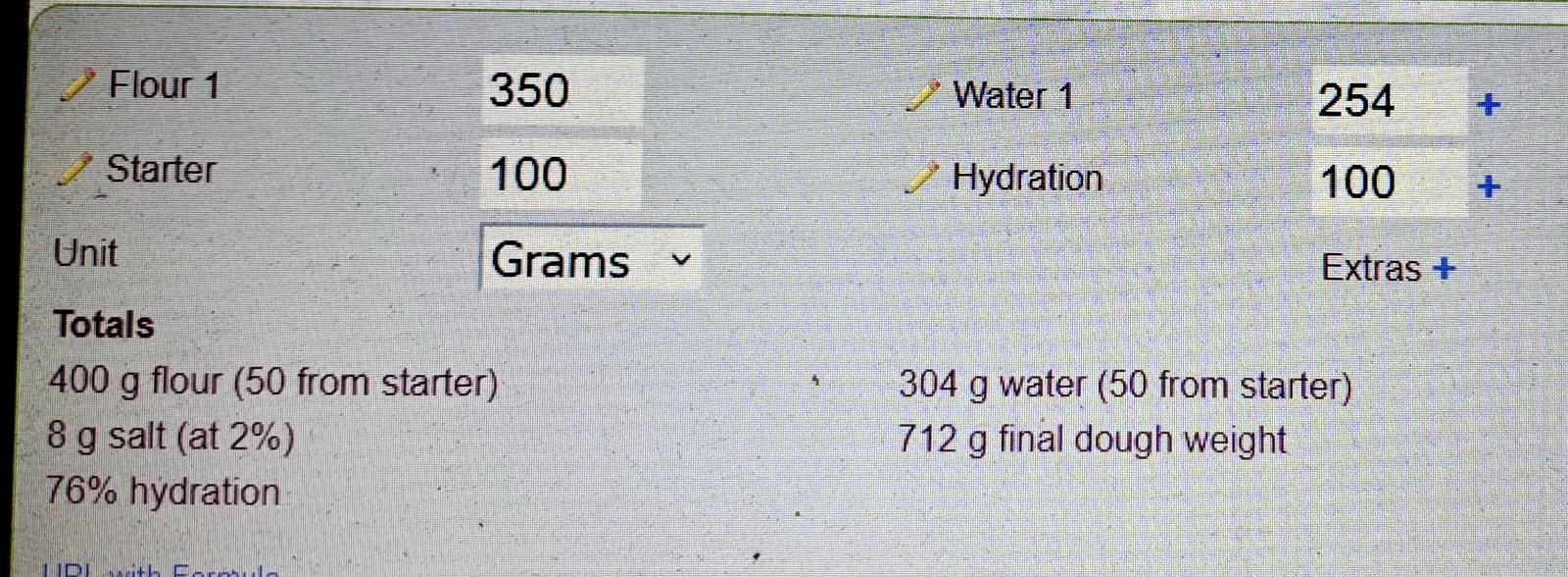 Брашно - 350г - 250 среднопротеиново + 50г високопротеиново + 50г п.з. . Закваската ми (на 7.30 часа и 100% хидратирана)  е 15г +35 + 35  и ползвах цялата.  Вода - 260г (хидратация 77%) , сол 8г, 1ч.л. захар и 2с.л. олио