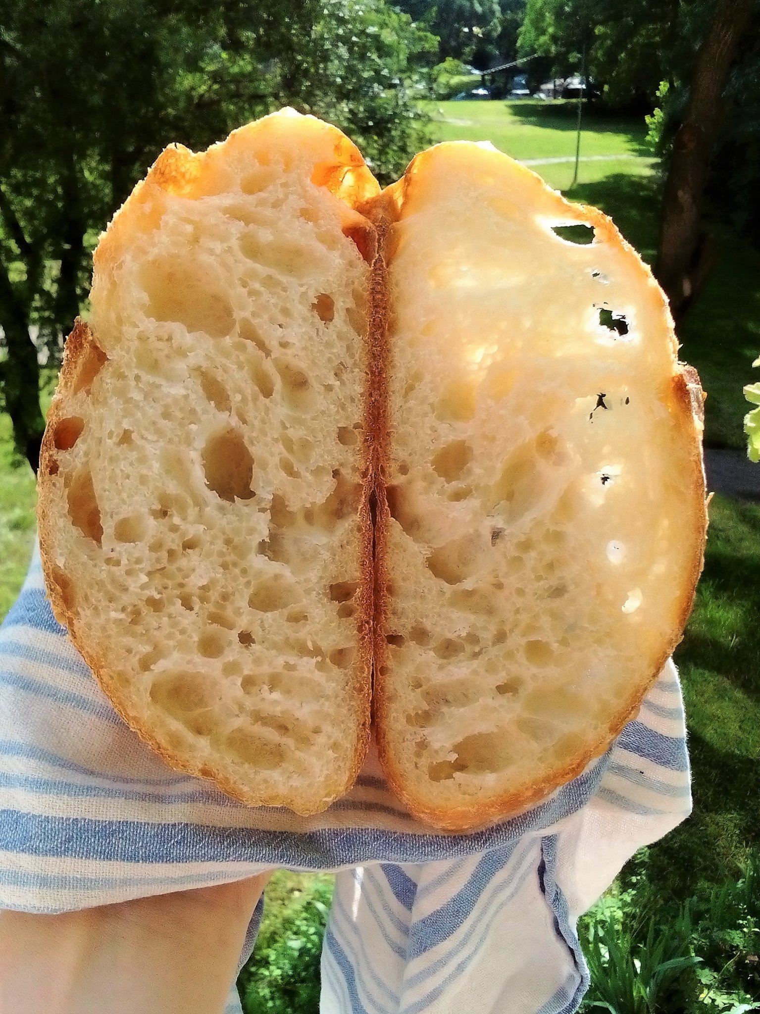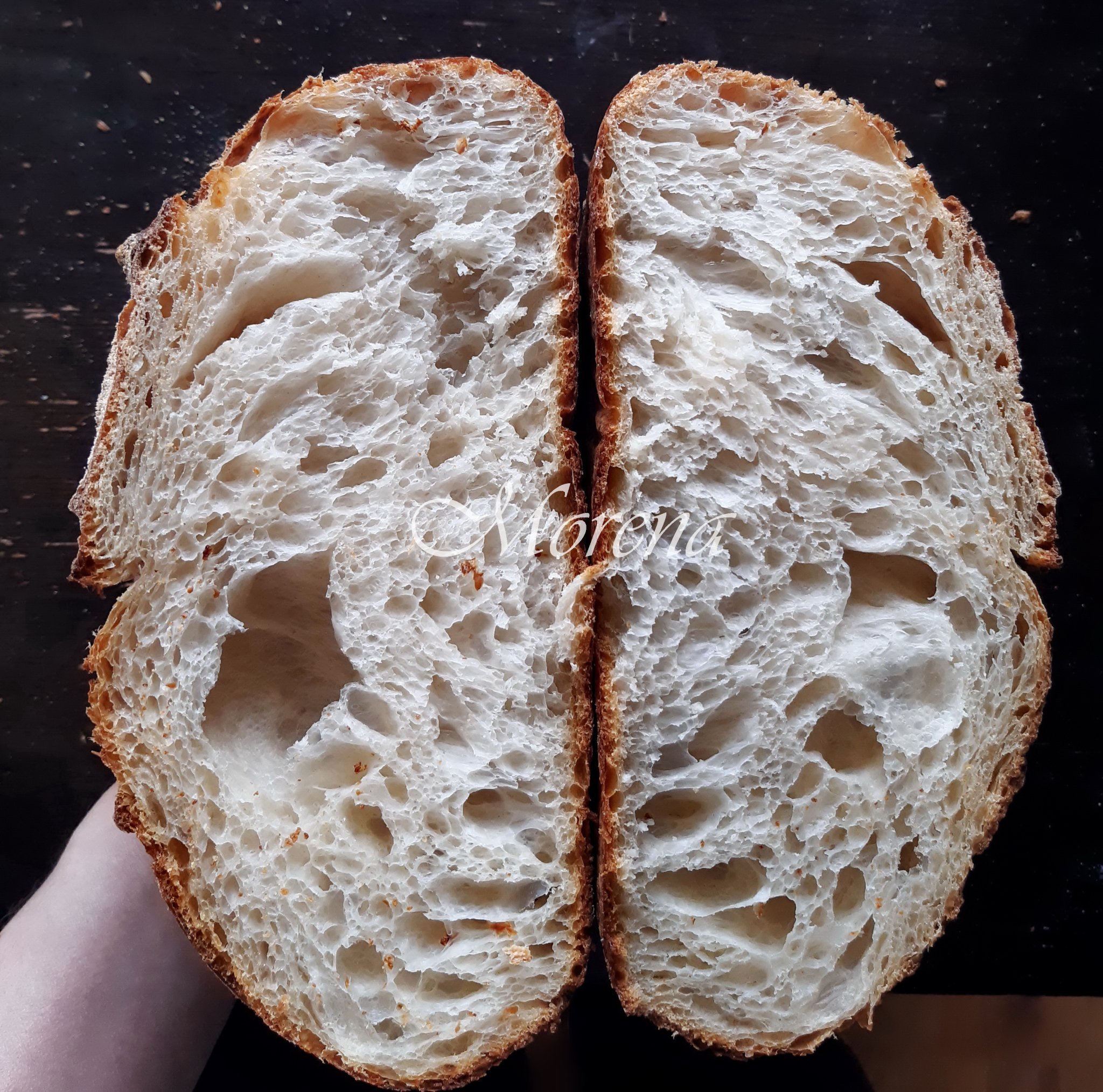 Бяло хлебче с  брашно 11.02г белтък  +  такова с 13.2г - 2:1,  вода и 1 яйце и общо 78% хидратация и квас 100% хидратиран и на 7 часа,   сол, захар и олио.  2 часа Автолиза, квас, сол, сгъване на плик и ламинация, втасване и 2 сгъвания  - 7.30 часа насипна ферментация и 36 часа ретардация - вече съм влюбена в дългата такава. 🙂  Страхотна средичка и коричка,  и вкус! 🙂