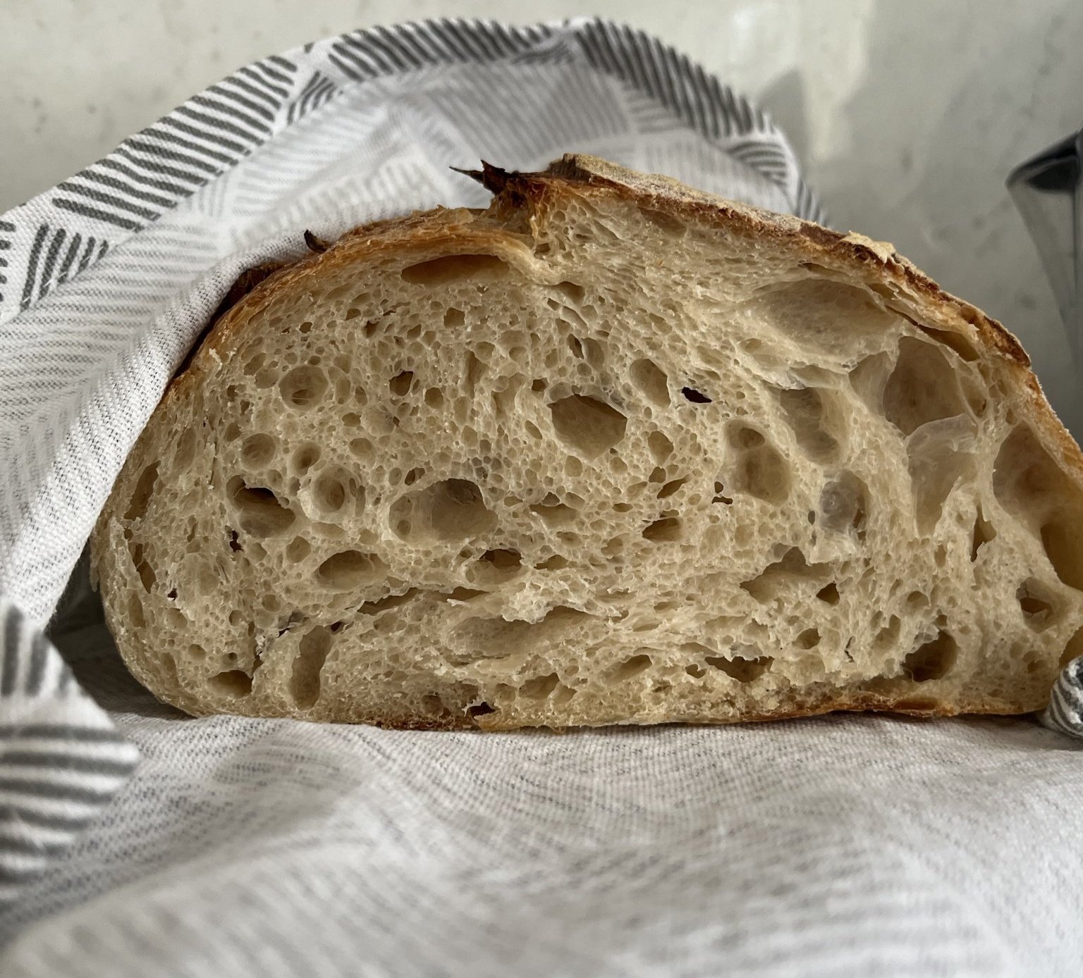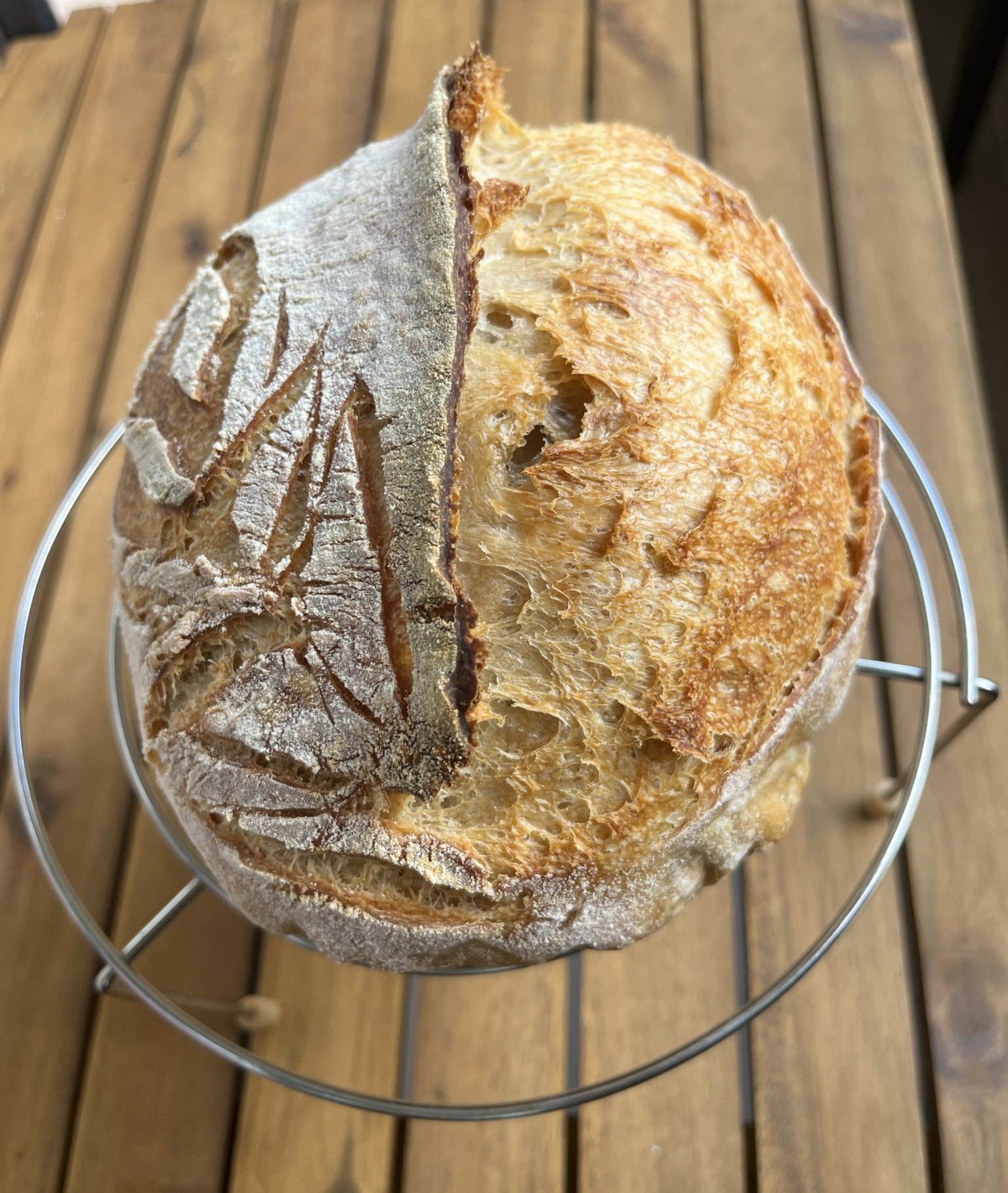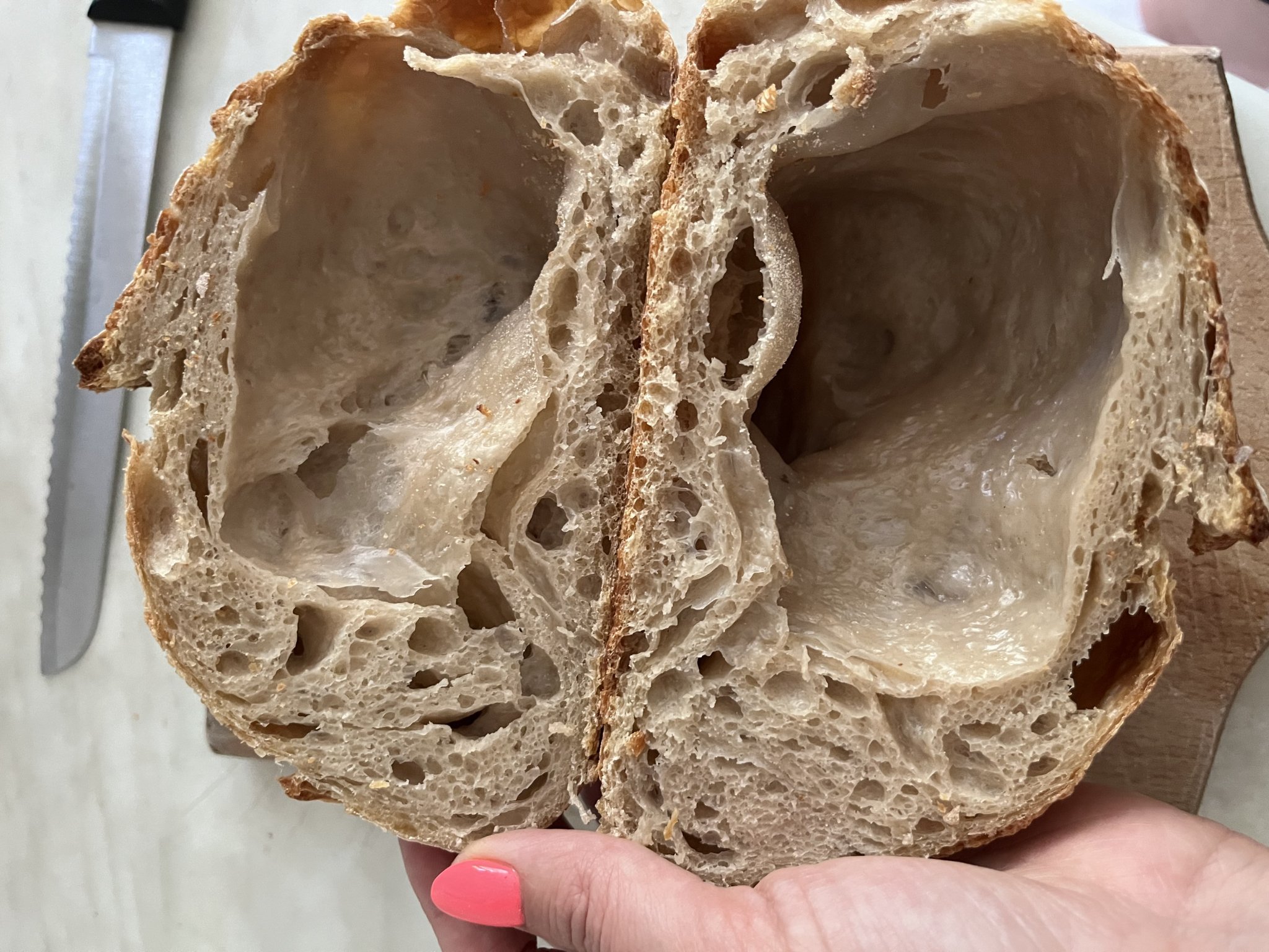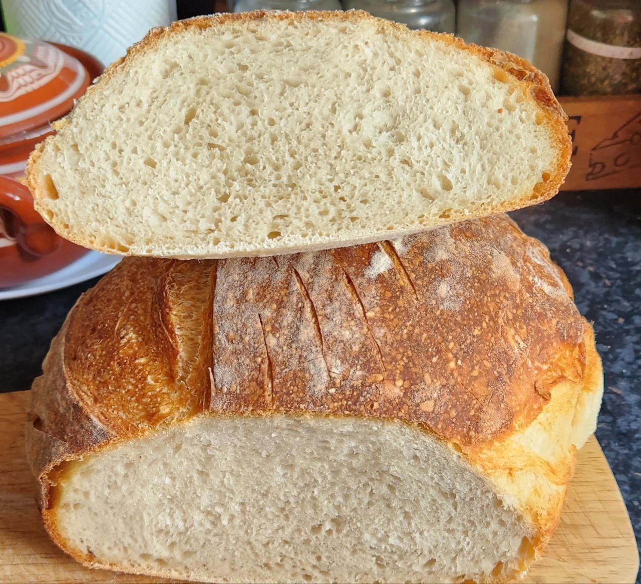 Хора, моля ви кажете къде бъркам. Днес пекох пълнозърнест и бял хляб. Пълнозърнестият няма визия, но стана вкусен, проблема е белия. На външен вид изглежда перфектен, тъкмо си помислих, че най-после започва да ми се получава както трябва и като го разрязах- изненада, огромна дупка, като хралупа:) Също така е и жилав и влажен вътре. Според вас това на какво се дължи, дали е превтасал/недовтасъл или пък не съм измесила както трябва? Брашното е 50:50 манитоба и бяло гръцко с 12% протеин. Направих автолиза, сол, месене, ламиниране , 4 сгъвания, около 4 часа втасване на стайна температура, след това за през нощта в хладилника. Пекох днес на обяд. Ще съм благодарна за съветите ви!