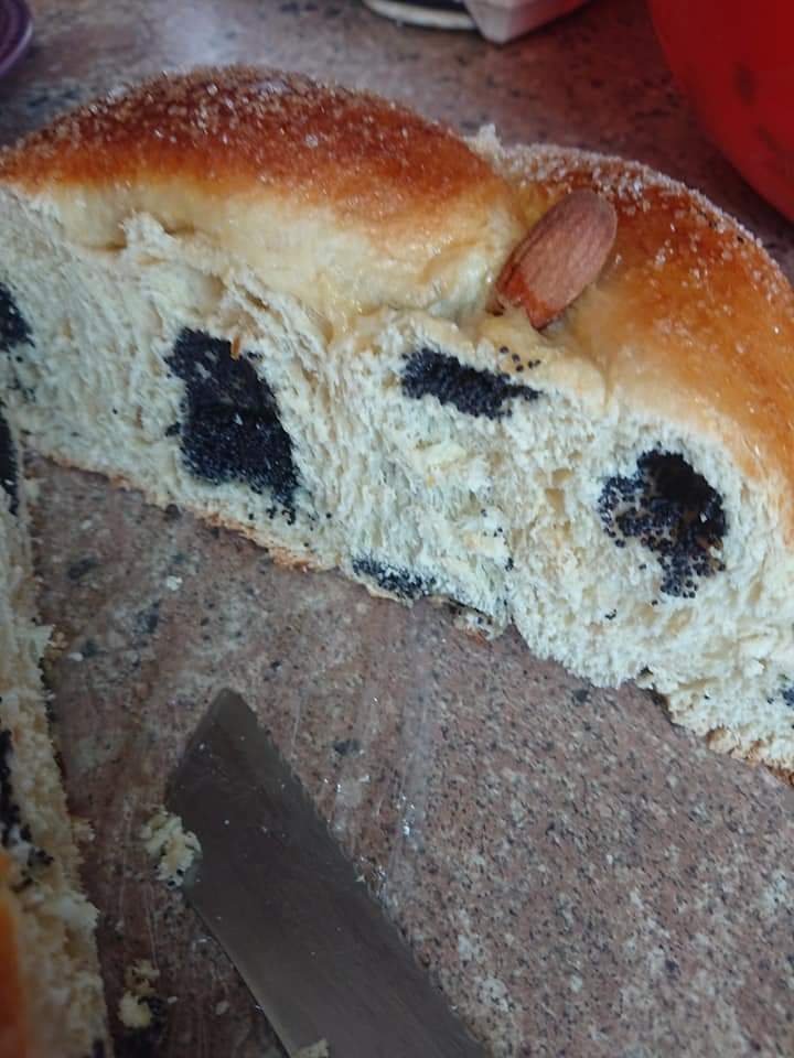 Това е миналогодишния, по рецеота за Теадиционен козунак, с макова плънка и левито мадре от стафиди.