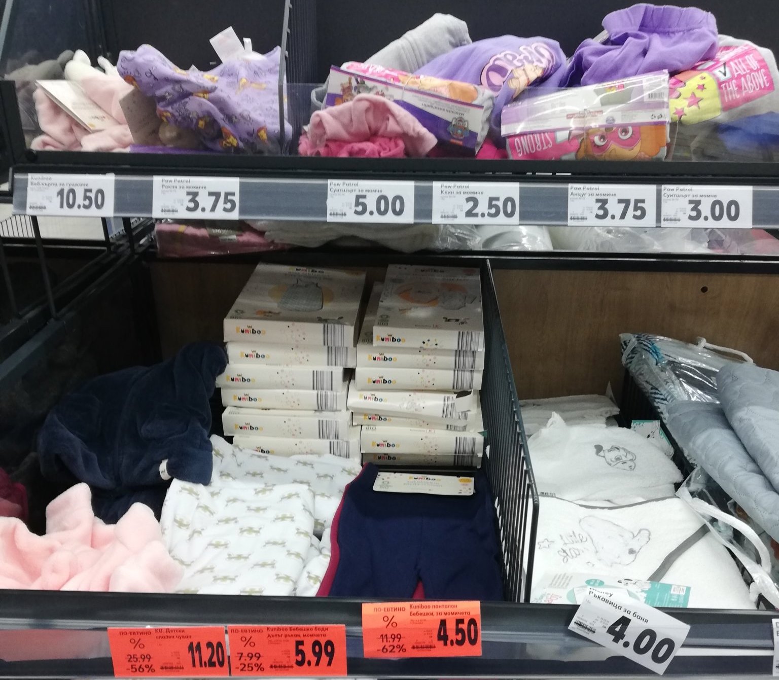 Никой не каза, че детските дрешки са намалени. Взех комплект от 2 панталончета за 4.50. бебешка шапка и ръкавици за 1.75, шапка и ръкавици за по- голямо дете ( зимни) 2.50. суитшър с пес патрул за 5 лв. Имаше много бодита намалени на около +лв за 2 бр.