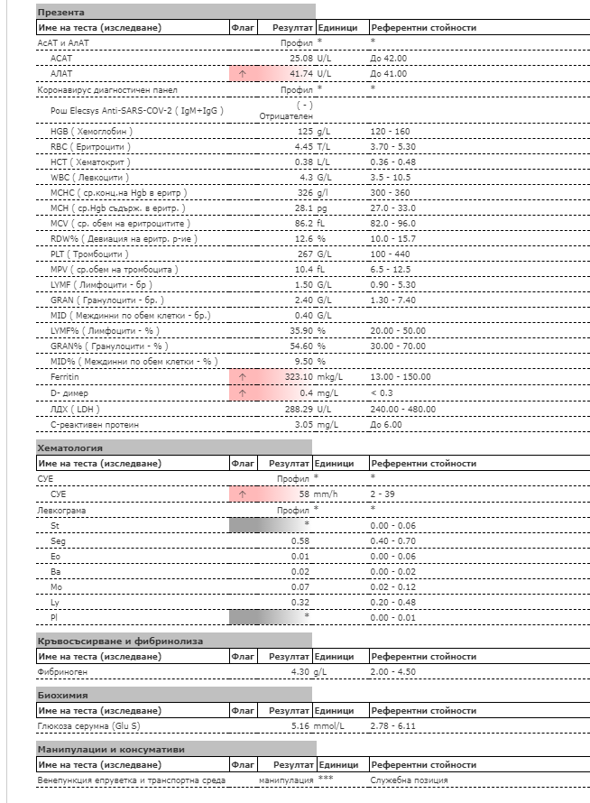 Здравейте! Ще опиша  ситуацията в която се намираме със съпругата ми, и моля за съвет какво да предприемем защото нашата ЛЛ неглежира ситуацията. От 31.03. сряда съпругата ми е със симптоми след контакт с нейна колежка, която е положителна с PCR тест от 30.03. и от тогава се изолирахме. Започна да се оплаква от болки в мускулите и леко покашляне. На 04.04 неделя направи антигенен тест от аптеката, който излезе положителен след което се обадихме на ЛЛ, за да назначи лечение на двамата понеже и аз започнах да усещам някакво дразнене в гърлото. Понеже ние от октомври месец приемаме цинк, магнезий, д3, омега3 и селен, самопредписахме си от събота и Авирон Рапид  по схемата от листовката, и пием аспирин протект от 31.03. След разговор с ЛЛ тя каза че пием каквото трябва и няма нужда от друго. Снощи съпругата ми вдигна еднократно Т 37.5. Днес тя си пусна кръвни изследвания, след което се обади на ЛЛ, за да и каже че снощи е вдигнала Т и е започнала да кашля на което тя заяви да започваме и двамата антибиотик Азитромицин. Към този момент изследванията все още не бяха готови и когато излязоха и супругата ми и написа във вайбър да ги погледне, а нейният отговор беше, че има няколко разминавания и да продължим с антибиотиците и двамата. Та притесненията ни са че има  завишен феритин и трябва ли да предприемаме нещо спешно или се филмираме излишно.