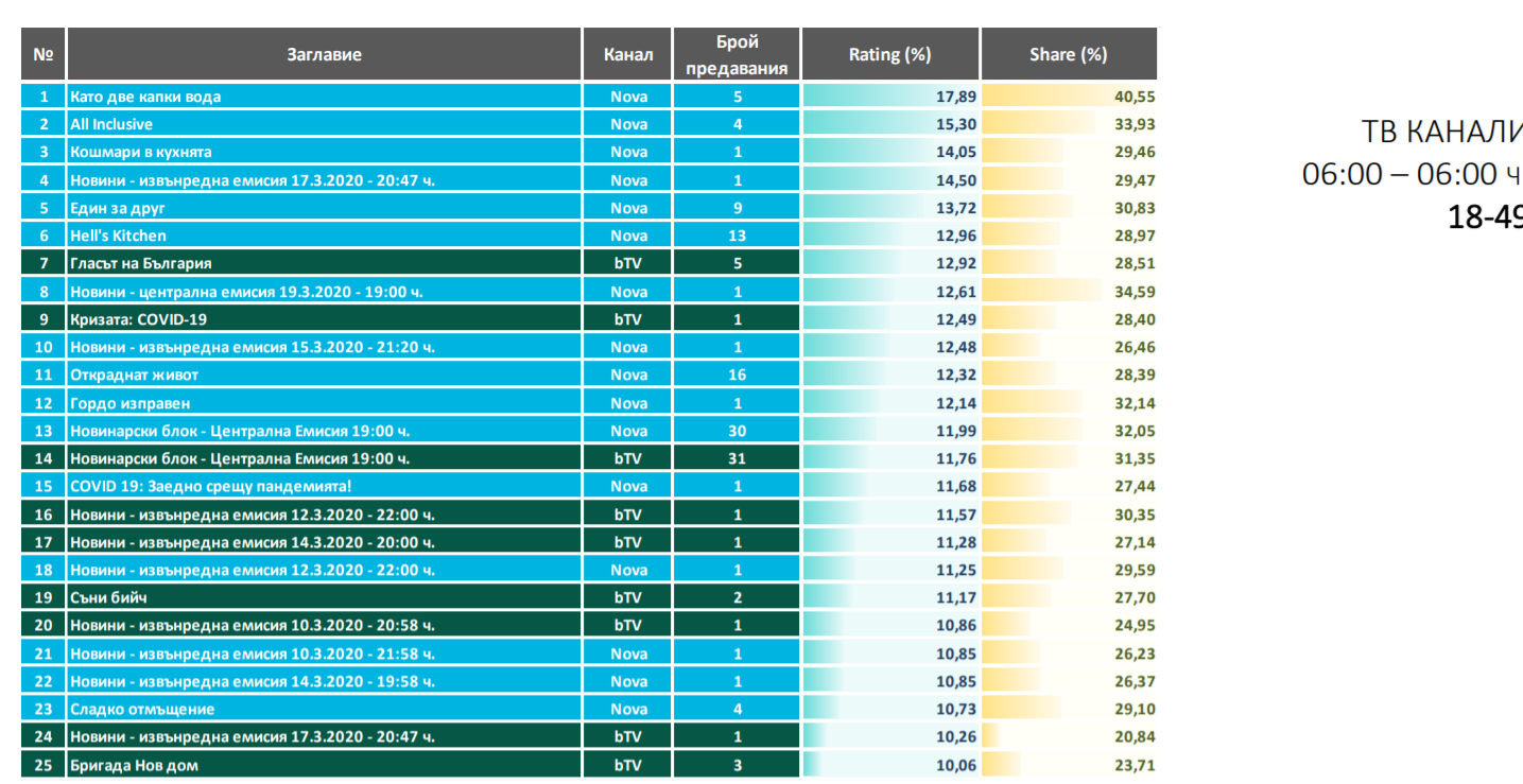 Рейтингът за март месец е впечатляващ , вторият най-силен за ОЖ, като рейтинг изобщо. Ако се задържи около тези стойности, ще е най-гледаемият сезон. Това, че всички са си вкъщи е помогнало за повишаването, тъй като пролетният сезон обичайно е труден.