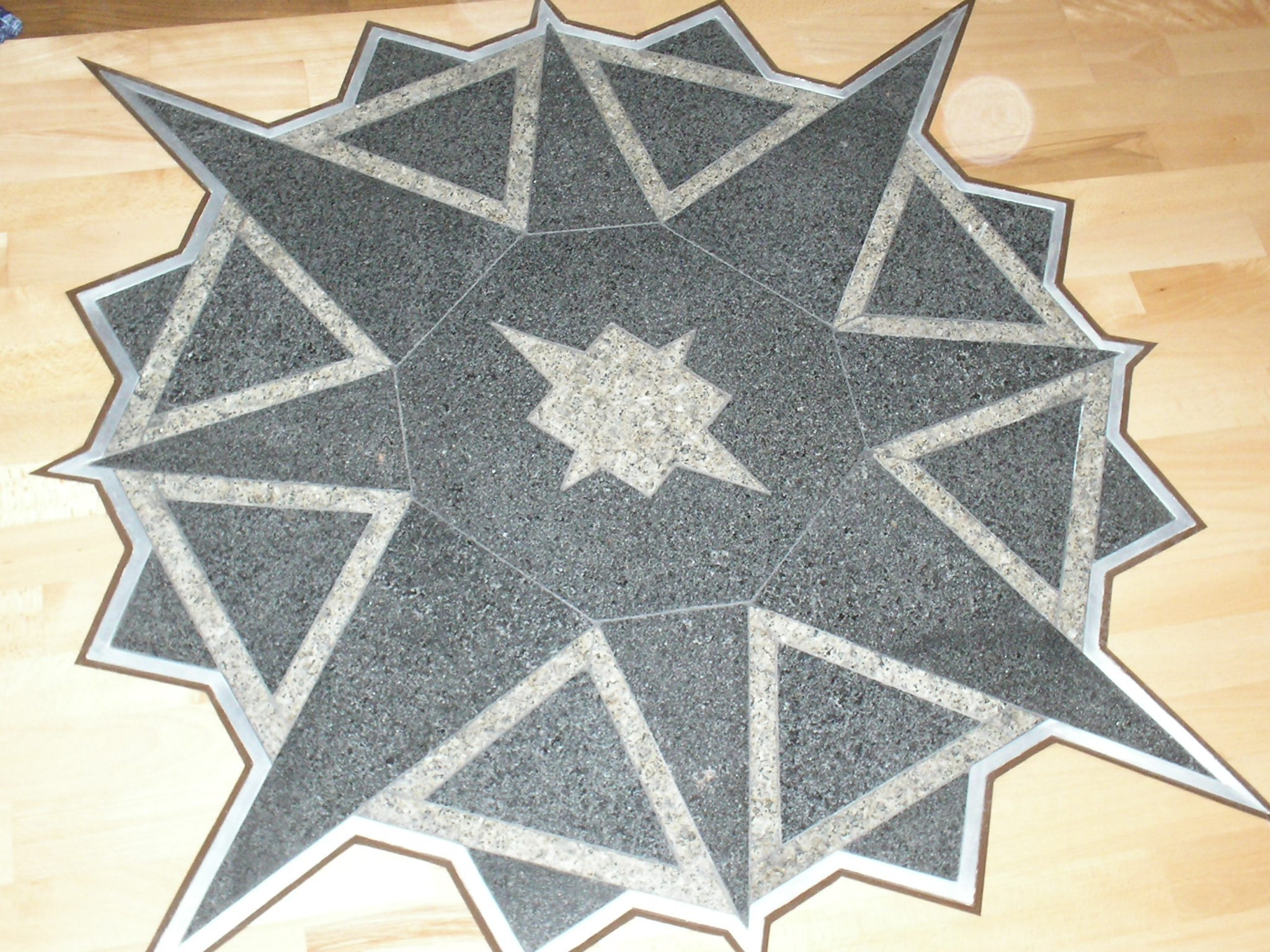 и в хола на пода, от 2 цвята гранит е, отстрани защитният пояс около гранита е изрязан от алуминиева ламарина, а кафявото е с боя отсичано, за да изпъкне, пак правено от мъжа ми по мое желание да е 8-лъчева звезда, а проектът си е негов, сам е изрязвал гранита и е сглобявал, направено е в 3-слойния буков паркет в центъра на стаята