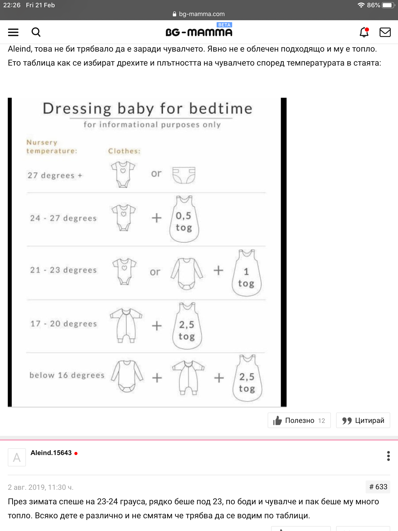 Ева на третия етаж, на колко градуса спите? Аз все се чудя кога да сменя зимния с пролетният чувал. Все ме е страх, а се водя по таблици с температурата и обличането на бебетата.