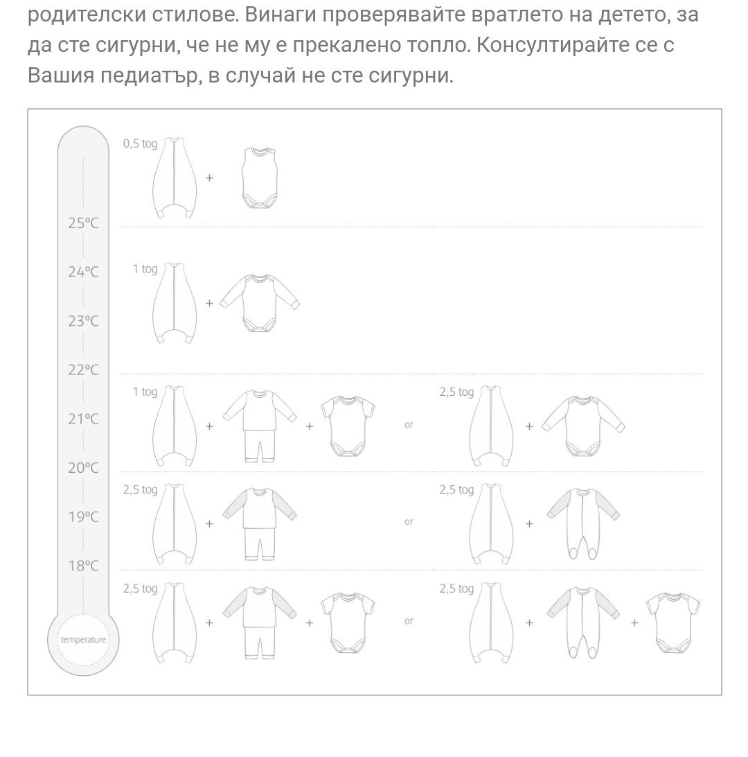 В сайта на Angel Baby е обяснено как трябва да е облечено бебето под чувала в зависимост от температурата в стаята. Simple Smile