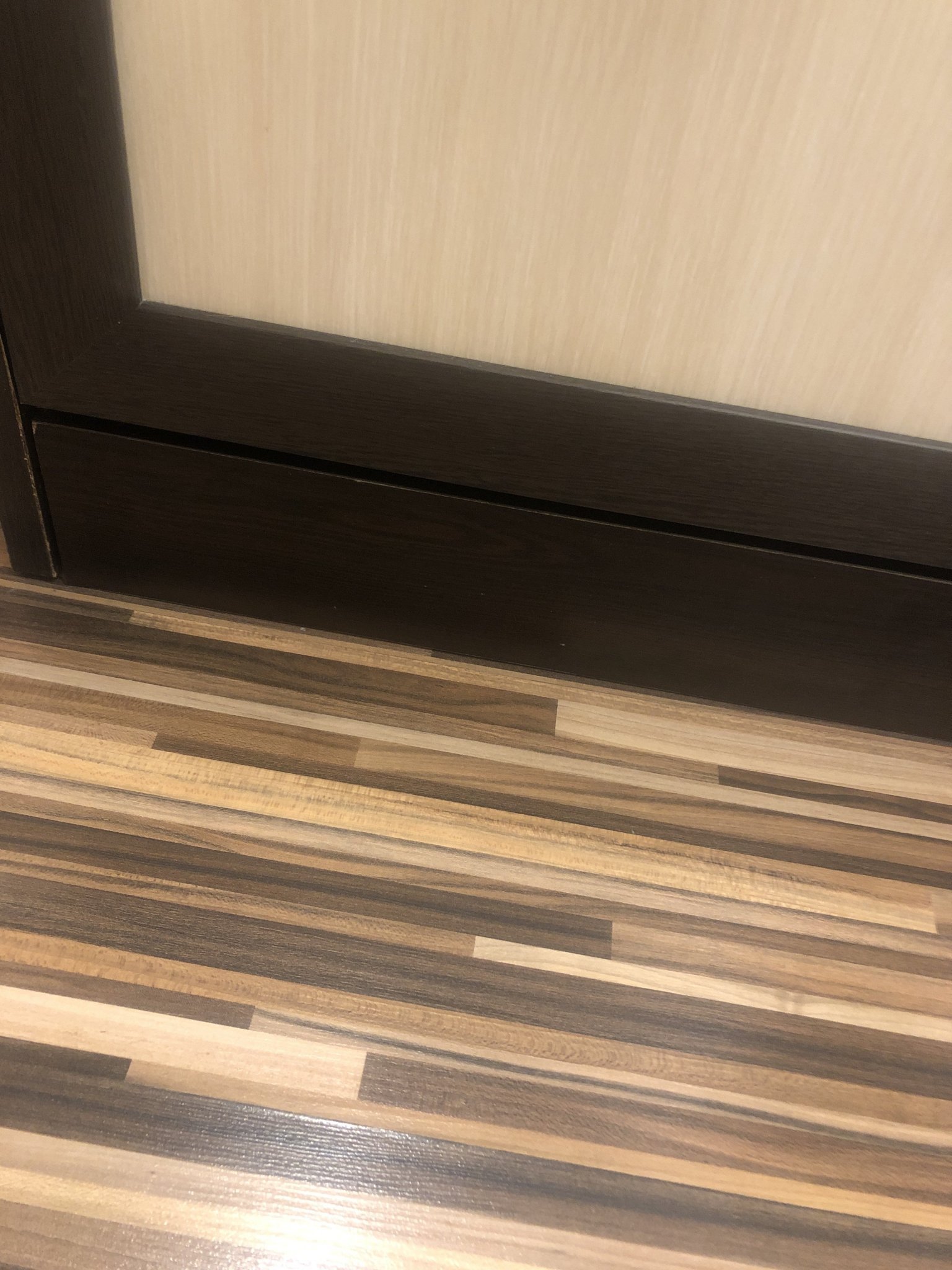 При мен не е изрязано нищо. Разстоянието от вратата до цокъла е 8,5 см. и проекцията е на около 5 см. от цокъла. Явно проектора е под наклон.