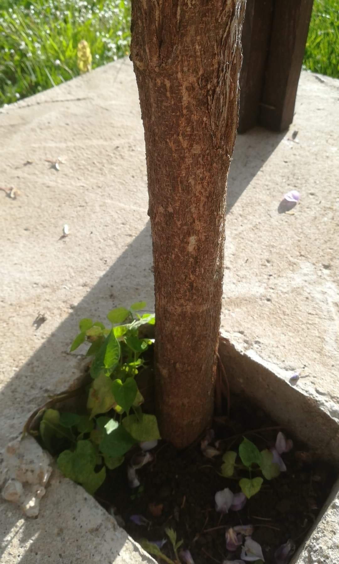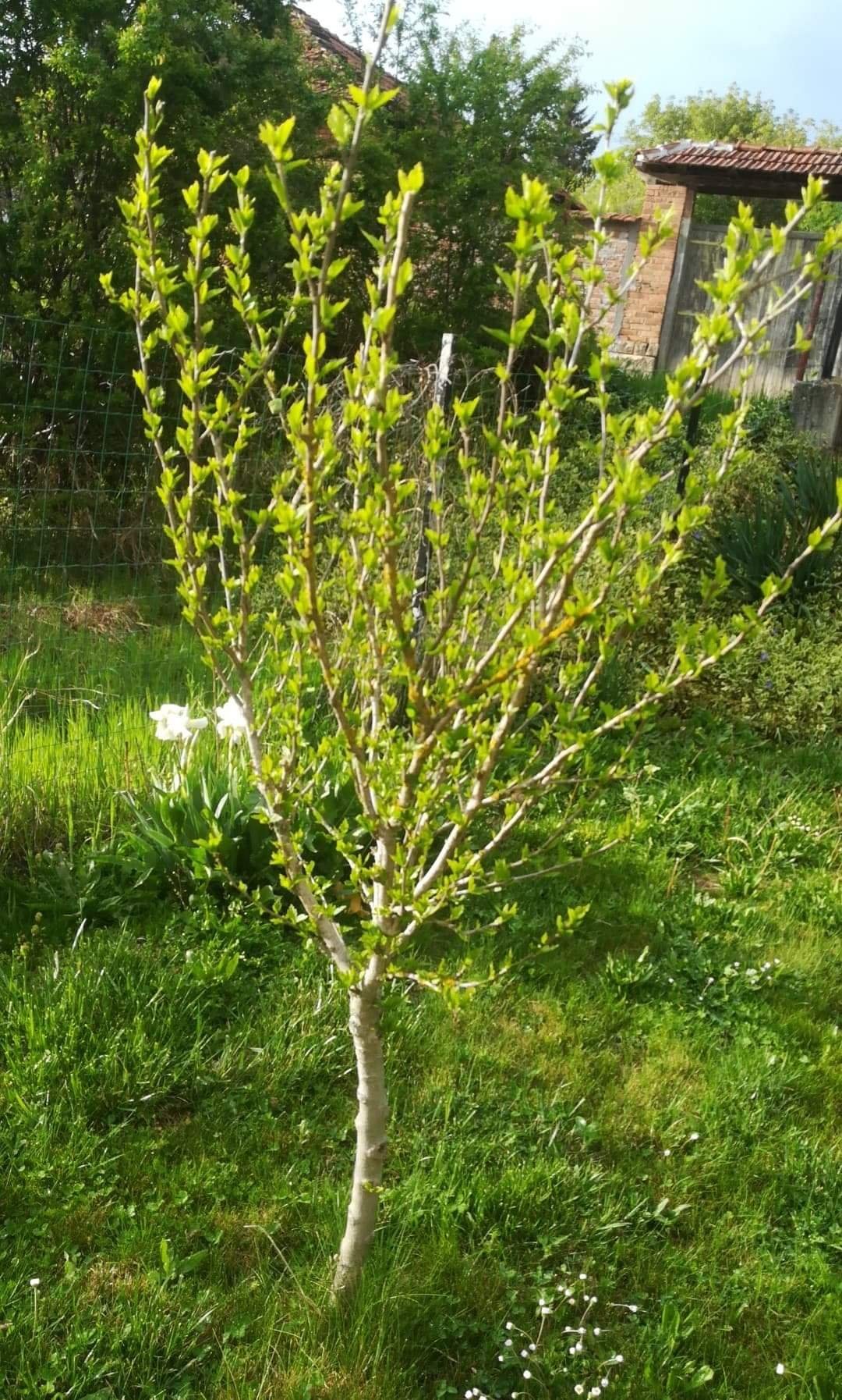Люлякът е вързан, защото се беше превил зимата от надвиснали клони. Скоро се надявам да го освободим.