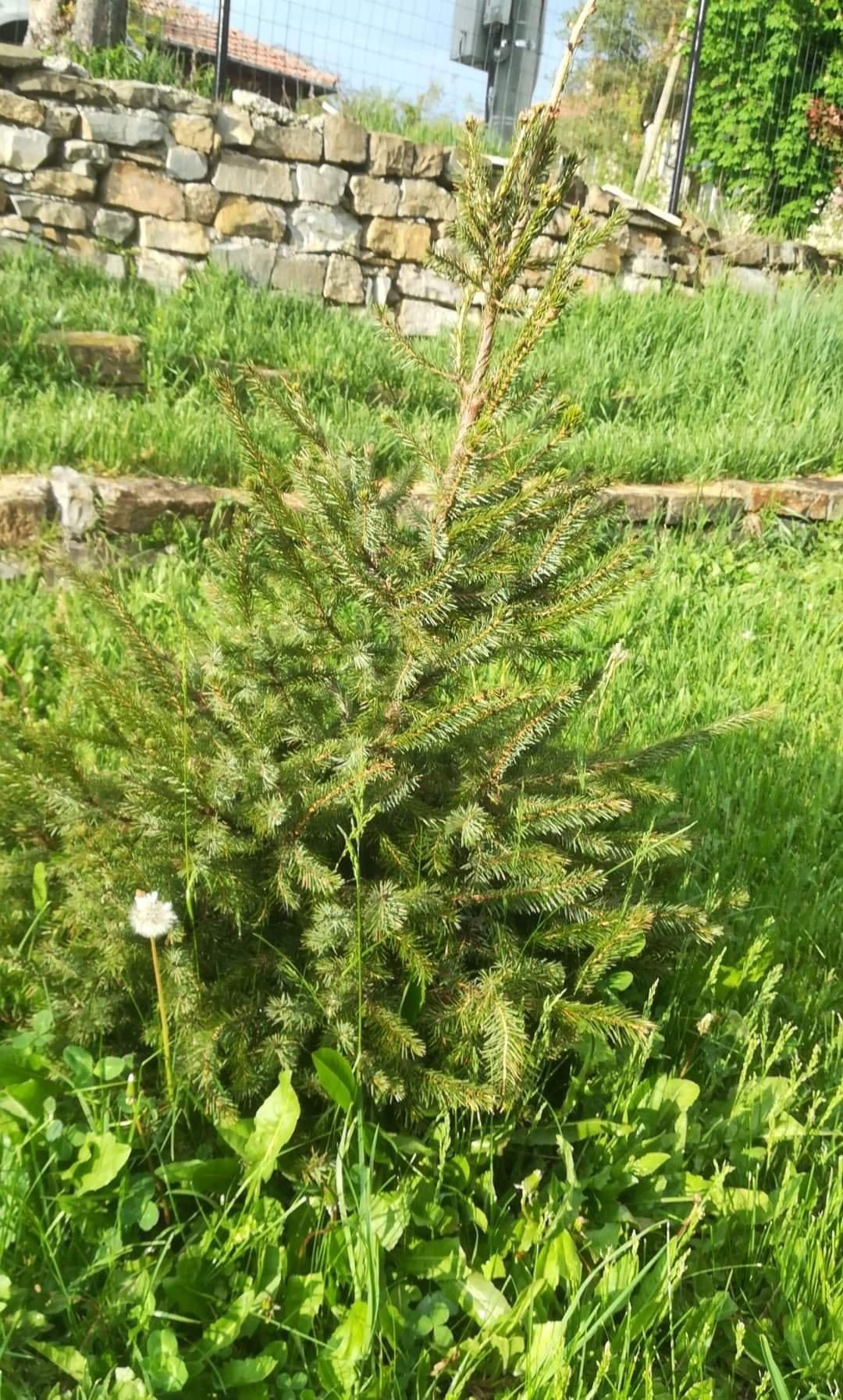 Новогодишната ни елха, всъщност май смърч. Хвана се, дано не се предаде лятото.