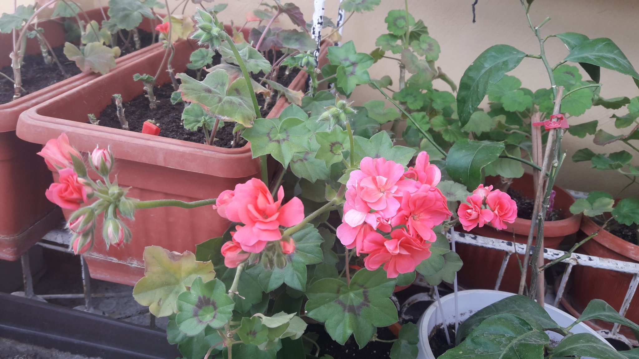 Това са първите красотички от терасните цветя. Сакъзчето го купих  миналата година и не спря да цъфти цяло лято. Сега пак се е отрупало с цвят и пъпки и първо ме зарадва. Другото сакъзче тепърва ще започва да цъфти и  по-нататък ще снимам и него. Мушкатите ги пресадих в сряда.