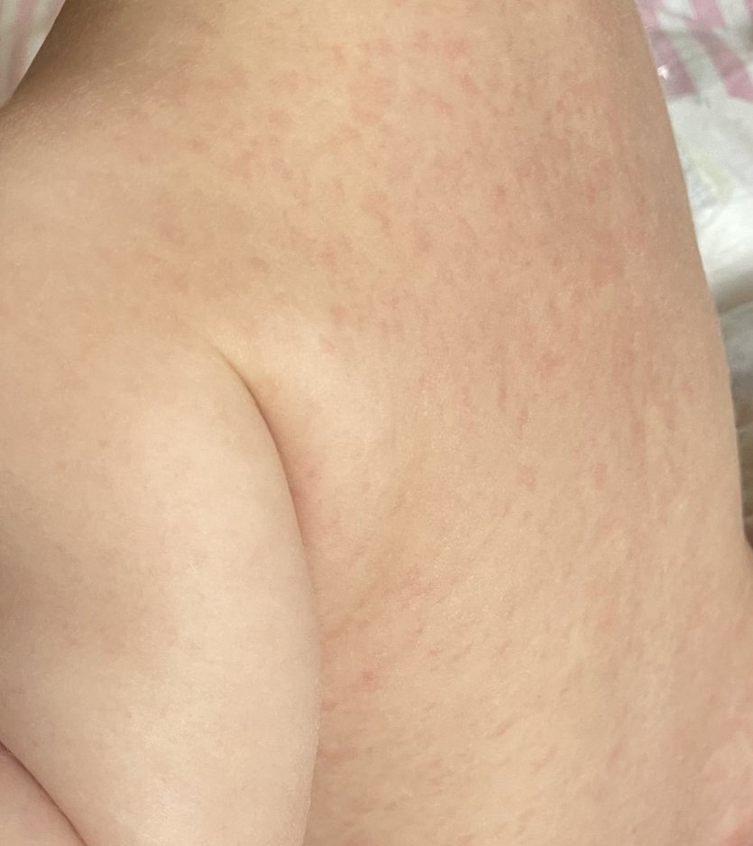 Здравейте, детето ми е на 7 месеца, да обобщя през последните имаше температура до вторник сутринта(ако в възможна алергия след температура) , вчера в 17:30 й се появи обрив, който обхващаше челото и главата, след това и под очите се появи, днес сутринта имаше по гърба, корема и гърдите, по меките части нямаше, нито в сгъвките на краката и ръцете, сменила съм праха за пране(но той е бебешки пак от максима на Бочко минах, като преди това съм прала с него чершафи, на които тя се р опирала) дрехите ги бях сложила в 8 сутринта, в 11 и 30 Пи за първи път биозин кидс( ако е възможно от него), но малко преди да избие това я пече слънце на дивана беше( ако е възможно от слънцето) и й дадох за първи път от плодовите смутита на Хип( пише, че са само ябълка и банан), но ме притеснява от какво може да е и какво да правя, ще приложа снимка на гърба как й са, същото е по челото, главата, корема и гърдите... Благодаря!