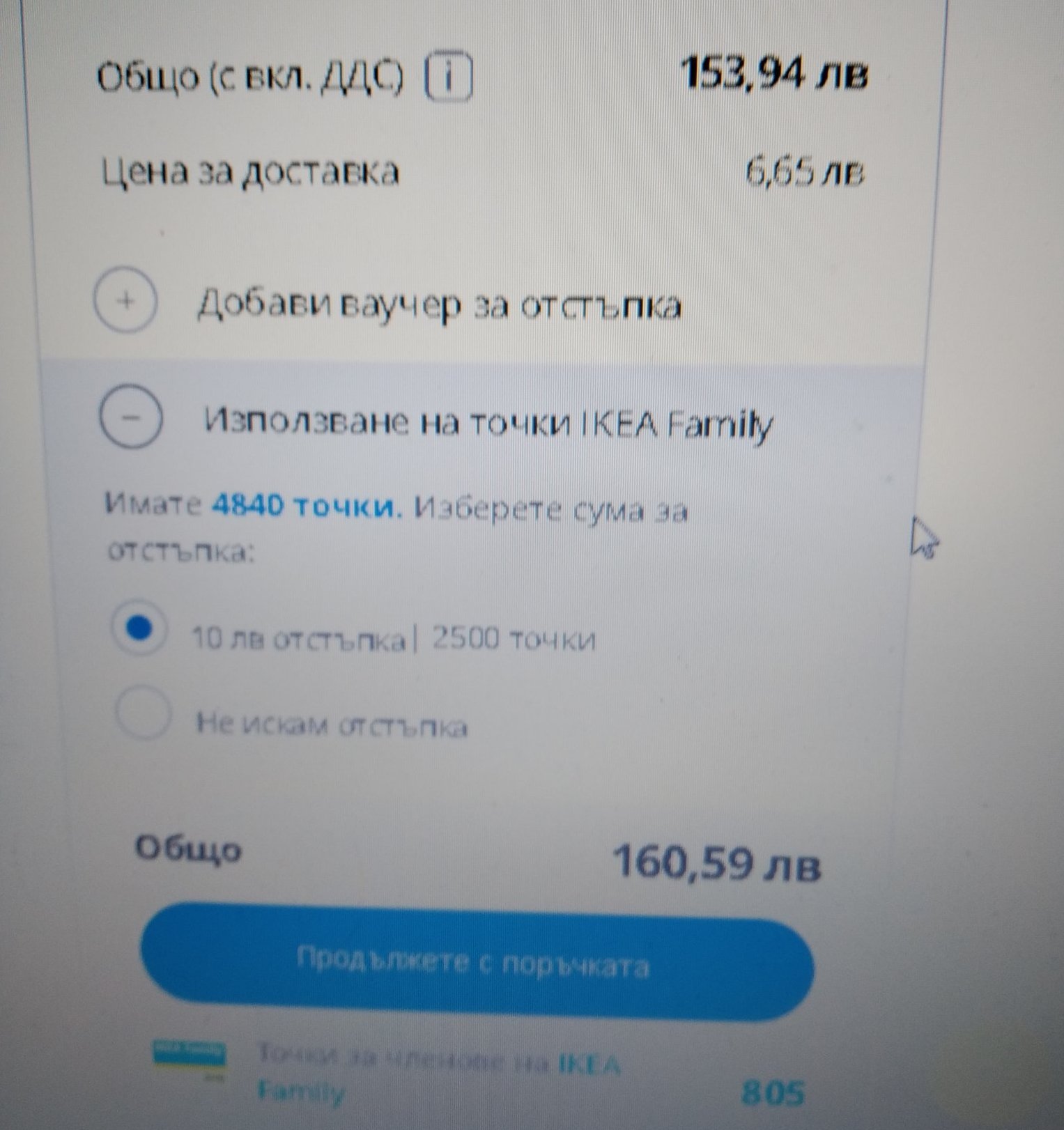 Срещам затруднение при първата си онлайн покупка в ИКЕА. Искам да използвам точки от ИКЕА Фемили, маркирам нужното, но сумата остава непроменена. Това действие - през лаптоп. През телефона изобщо не ми излиза полето "Използване на точки Ikea Family"..