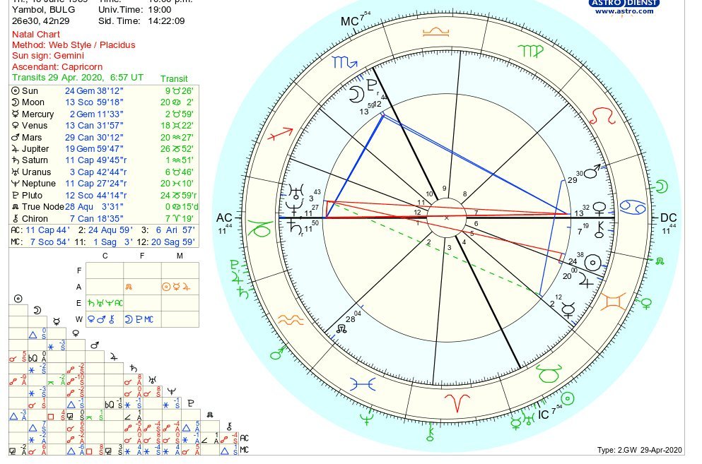 Един от факторите е Уран в Скорпион,  в четвърти, в твърд аспект с оста на хоризонта, заедно с Луна, Рак на К12. Оста на меридиана е психологическата лична ос - двигателчето. В зависимост от зодиакалните знаци, планети там. Останалото е синтез от характеристика на знаци, домове, анализ на мидпойнти, триплицитетни управители. И не на последно място - усет.