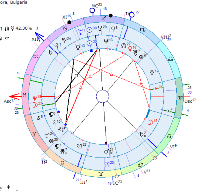 По дирекции - Сатурн слиза от DC и влиза в сесктил с Венера. Марс влиза в квадратура с Уран, а АС със Сатурн. Доста неспокоен и напрегнат перод ще е, но ще трябва да се преживее.  А като гледам след година - Уран ще се качи на МС и Меркурий ще направи секстил с нат. Слънце и ингрес в Риби. Ще има обрати и промени, като следствие на всичко това.