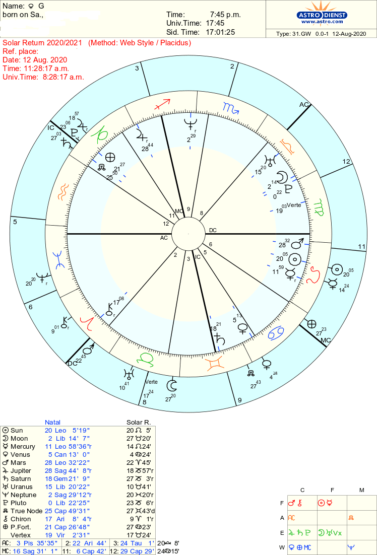 Привет, galinari! През миналият соларен основното ти е било личното израстване, самоусъвършенстване, слънце 1ви дом- това, което можеш да постигнеш сам. Тази година имаш голяма възможност за кариерно израстване, положила си основите през изминалата и ако си се трудила упорито- сега следва признанието. Тази година ще вземеш решения, които ще окажат влияние за бъдещето ти-относно кариерата, сегашната ти работа, или професионалните ти цели. Старай се да си по-дипломатична през тази соларна година, но не задържай емоциите си. Трудности във връзката (не знам дали си обвързана). Възможно е да откриеш, че връзката ти не отговаря на очакванията ти. Отдаденост и пълна интимност липсват, ще има отчуждение(напр. Единият да пътува и да сте на различни места). Имаш ли интереси към психология/философия? Възможно е да полагаш грижи за родител, да го гледаш в твоя дом.