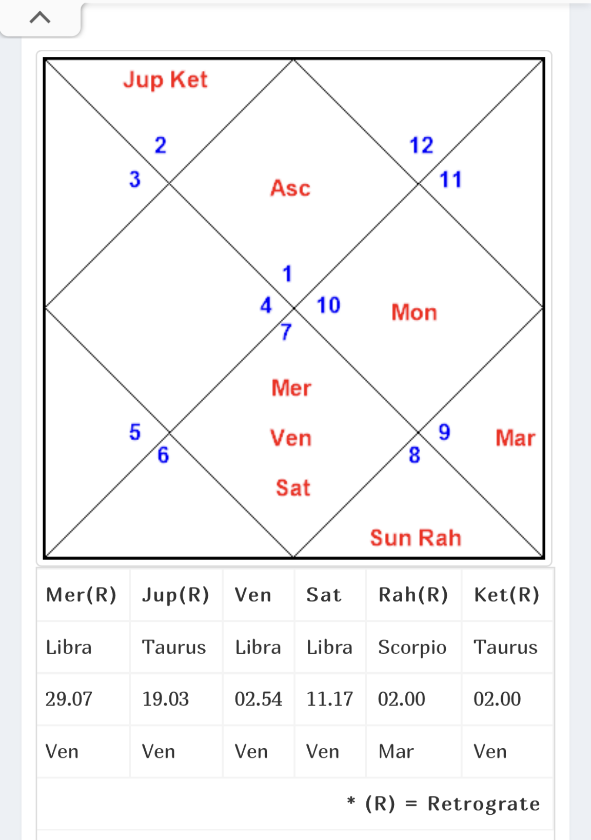 Може ли които разбира от ведическа астрология да каже 2-3 думи за тази карта. Благодаря предварително!