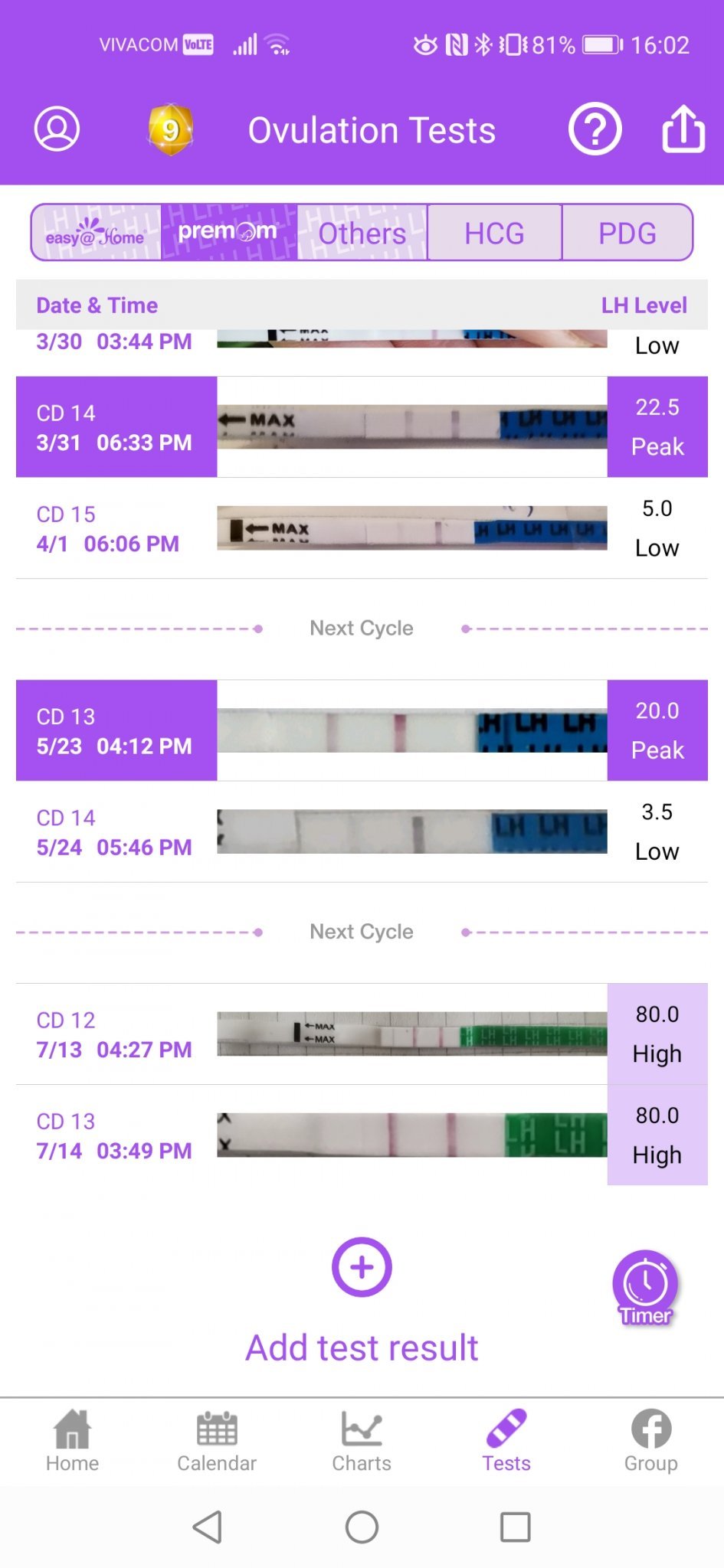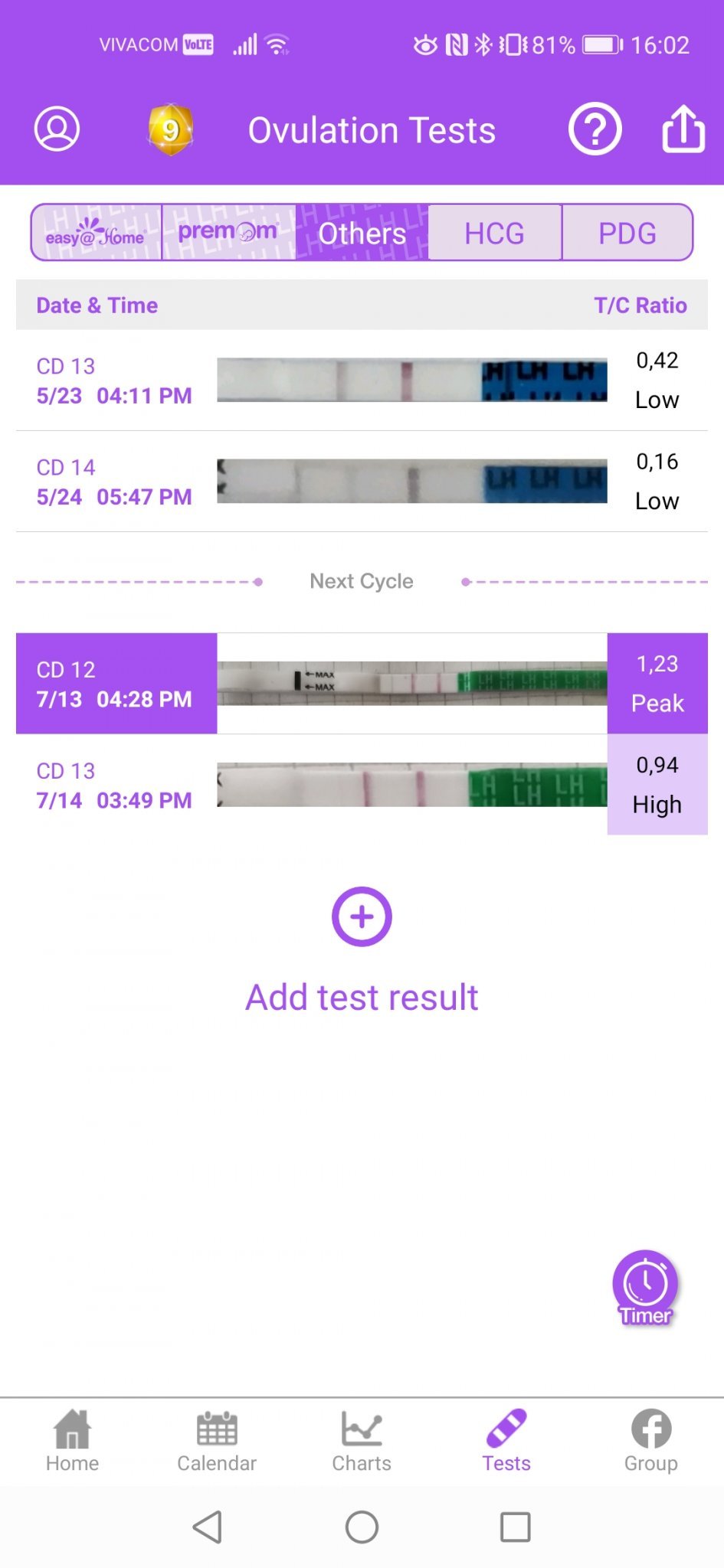 Два поредни месеца си правих тестове на Лейди тест и втората черта не ми се насищаше достатъчно, т.е. овушация според тестовете не е имало. Преди тпва следях един месец с тестовете на Oview и имах положителен тест. Този месец реших да заложа пак на Oview и ето, че имам или се доближавам до положителен тест. За мен на живо бяха еднакво наситени чертите, но и утре ще проверя дали няма да се насити тестовата повече. Та исках да наблегна, че май марката и цената на тестовете има значение. Исках да не давам по 10 лв за 5 теста, ама уви с по-евтините не успях да проследя овулацията.