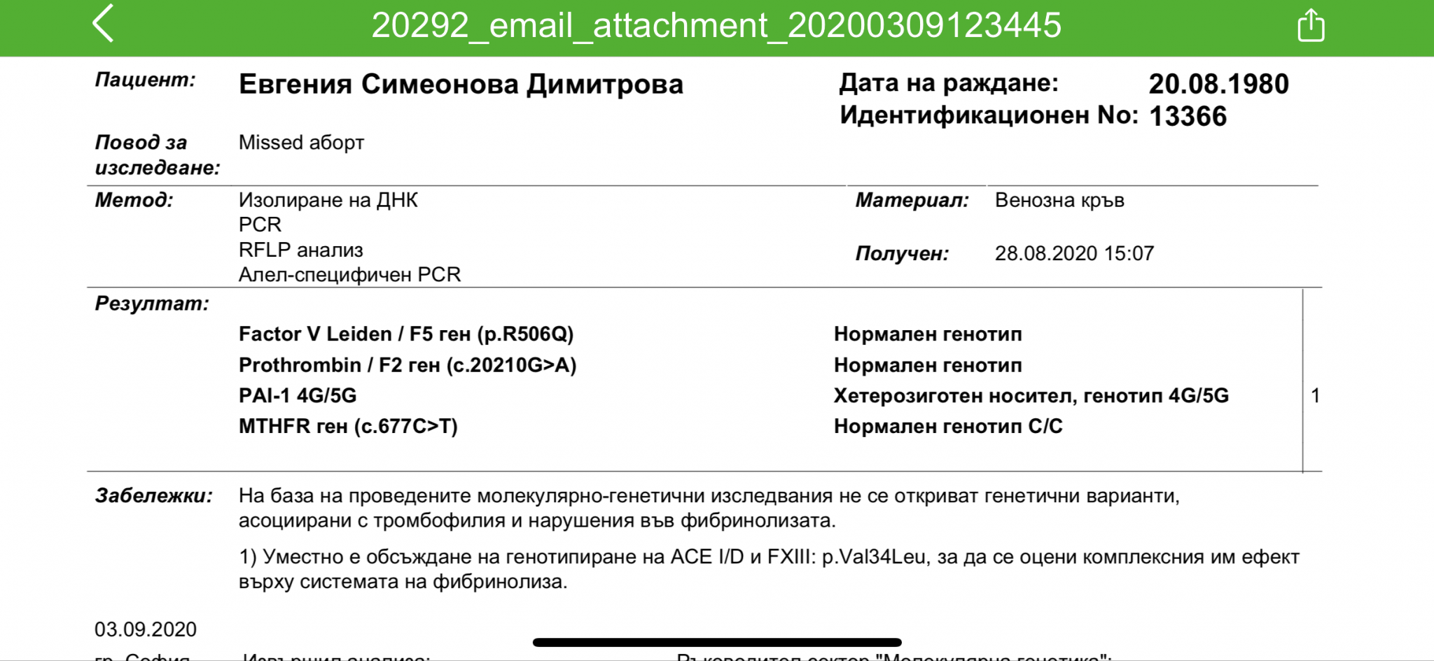 Моят мисед беше на 18.07. От тогава имам един цикъл, който дойде на 36-ти ден. Всичко изглежда добре за сега. Пуснах изследвания за тромбофилии и днес ми пратиха резултатите от Геника. Нищо не разбирам. И лекарката ми е в отпуска. Може ли някой да ми обясни?