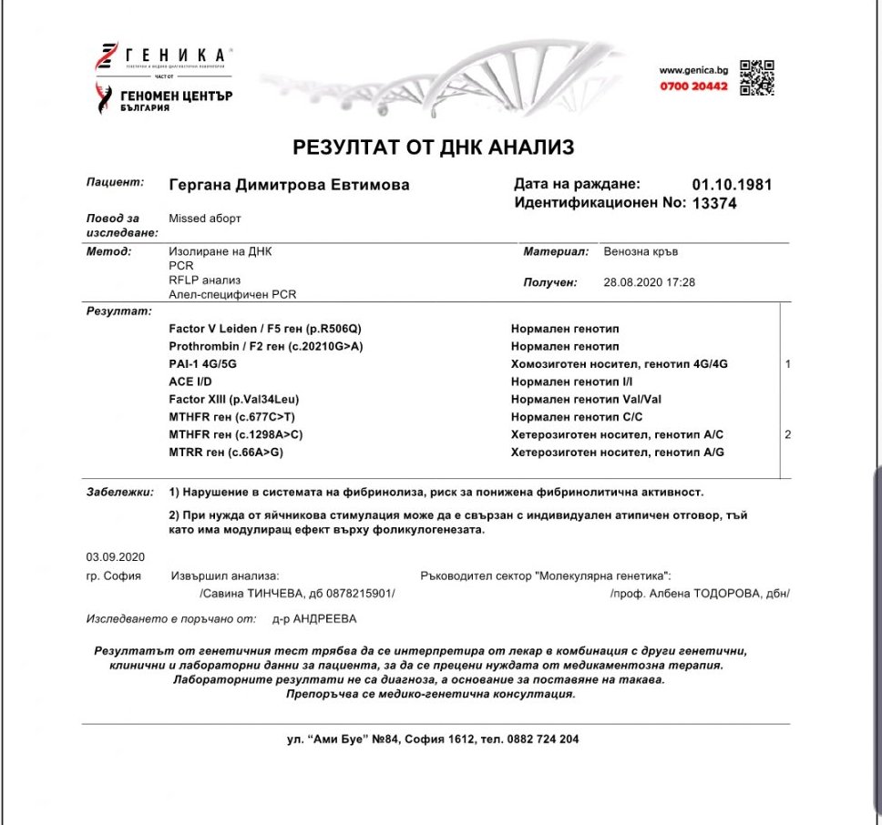 Имаш само една хетерозиготна мутация, която сама по себе си може да предизвика, а може и да не предизвика проблем. Пусни изследване на още два фактора - Фактор 13 и ACE, както са те посъветвали от Геника, за да може да се прецени дали ти е необходима терапия.