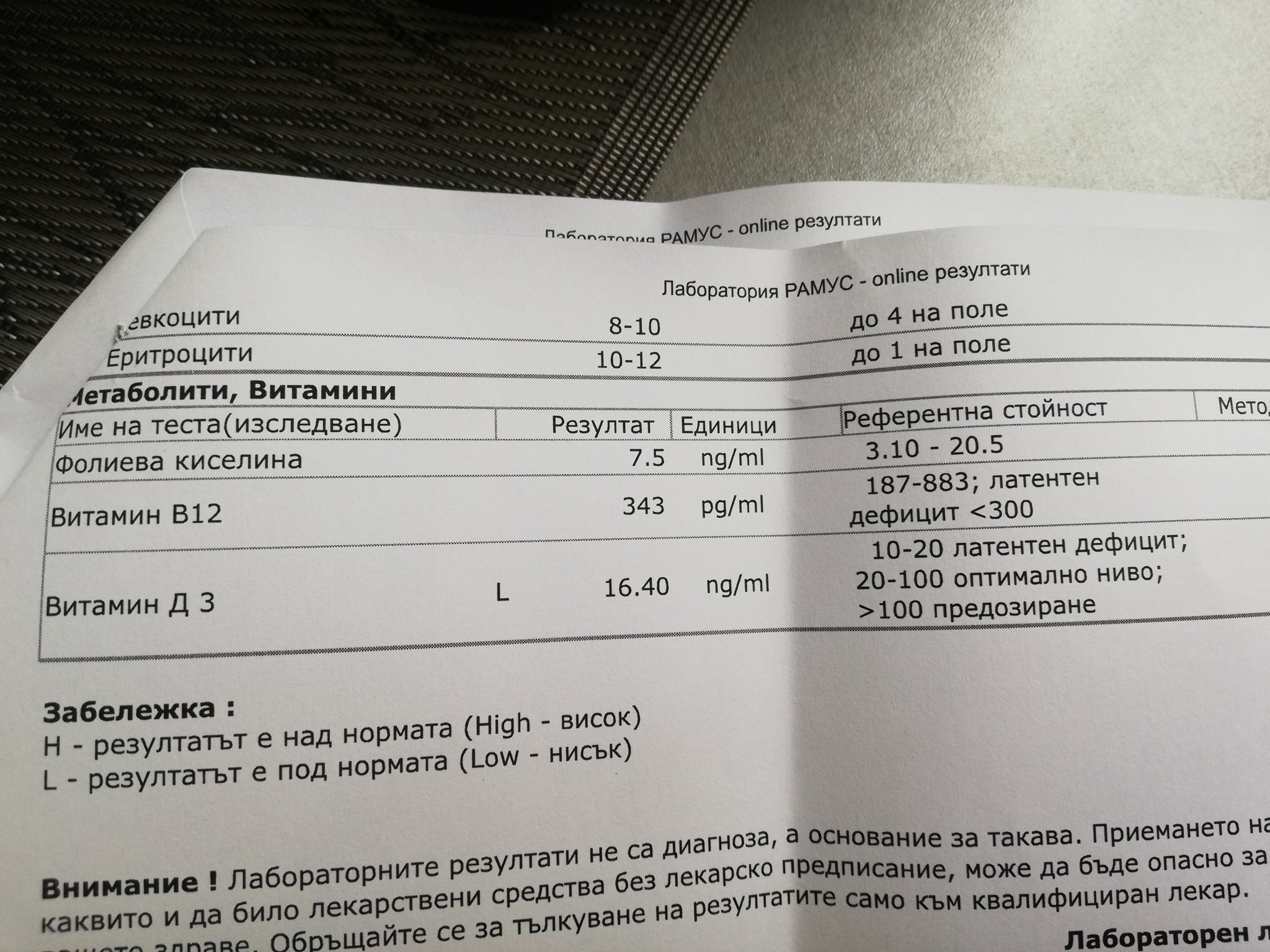 Здравейте! Преди два месеца и половина си пуснах изследвания на витамин д, б12 и фолиева киселина. Оказа се, че имам дефицит на витамин д, а на останалите два витамина много ниски нива. Започнах да приемам Вигантол по 10капки на ден, Метилкобаламин 1000 по 1 таблетка дневно и Неофолик мета по 1 таблетка дневно. Реших да си пусна контролни изследвания, за да видя дали има някакво раздвижване за тези два месеца и половина. Прилагам отдолу резултатите преди и сега. Определено има покачване, макар че не съм спирала приема преди повторните изследвания, но сега съм в чуденка дали трябва да продължавам да взимам подържащи дози? За витамин д е ясно, има още доста да се вдига, но б12 според мен е добре. Трябва да направя консултация с доктор, защото дотук всичко правя на собствена глава, но още ме е страх да ходя по болниците, предвид ситуацията.