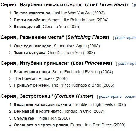 VikiE - Разменени места и Изгубените принцеси мисля, че са от историческите й серии. Има серия Гувернантките и някаква За удоволствие Simple Smile Поне такива са преведени и ги има в читанка.