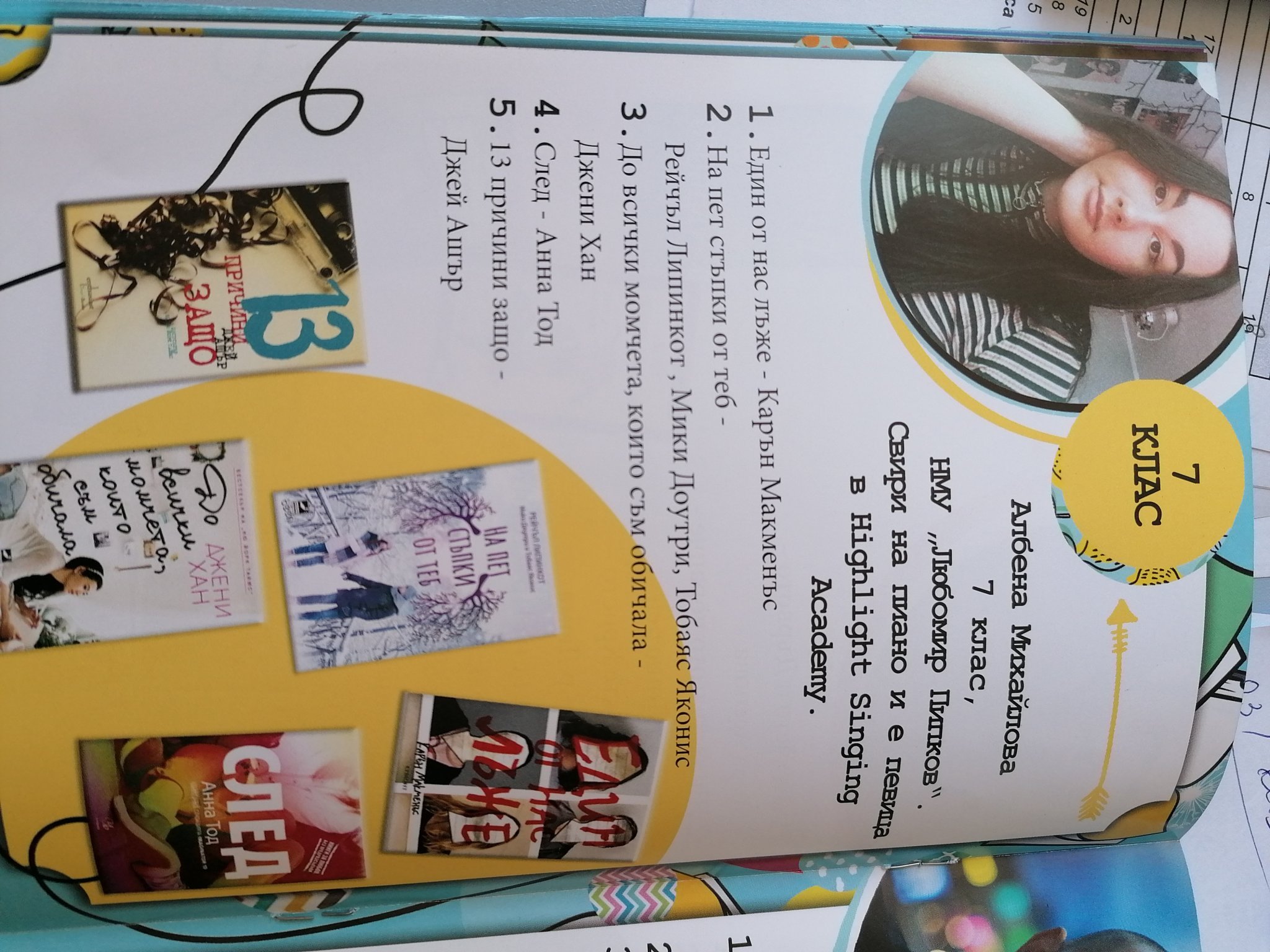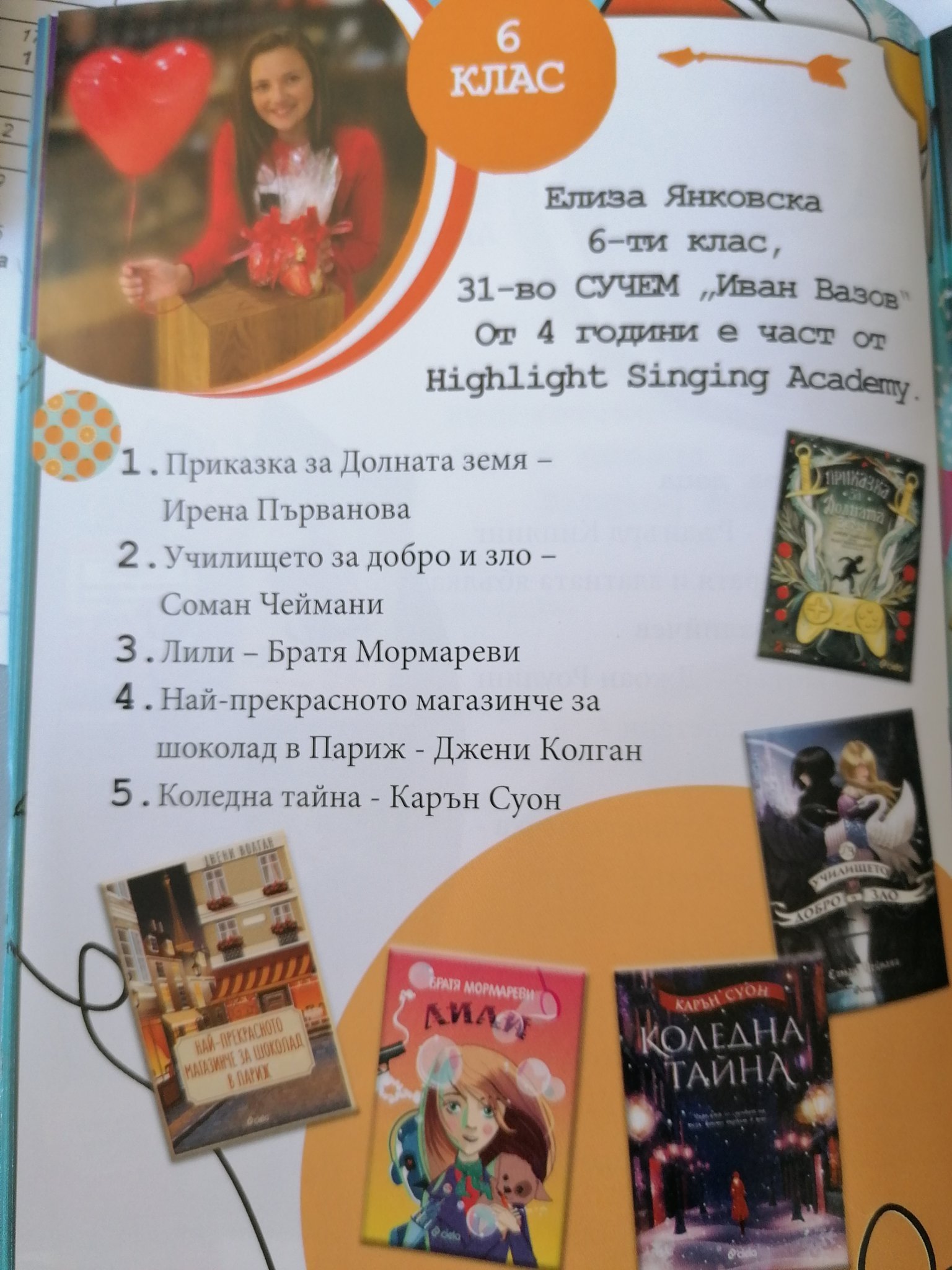 Шестокласничката е посочила два любовни романа /от списък с пет избрани любими книги/ Коледна тайна и Най-прекрасното магазинче за шоколад /не са еротични, но са любовни/