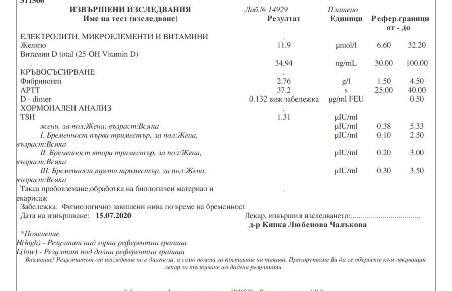 Днес ми мина прегледа при Паскалева. За витамините няма мнение. От изследването д-димера ми е завишен, а анти Ха е 0,25 на границата за увеличаване на дозата клексан. От предния път е спаднало на половина. Все пак ми препоръча да продължа с 0,4мл до към 30г.с. и след това да започна с 0,6мл за няколко дни и пак да ходя за контрола.