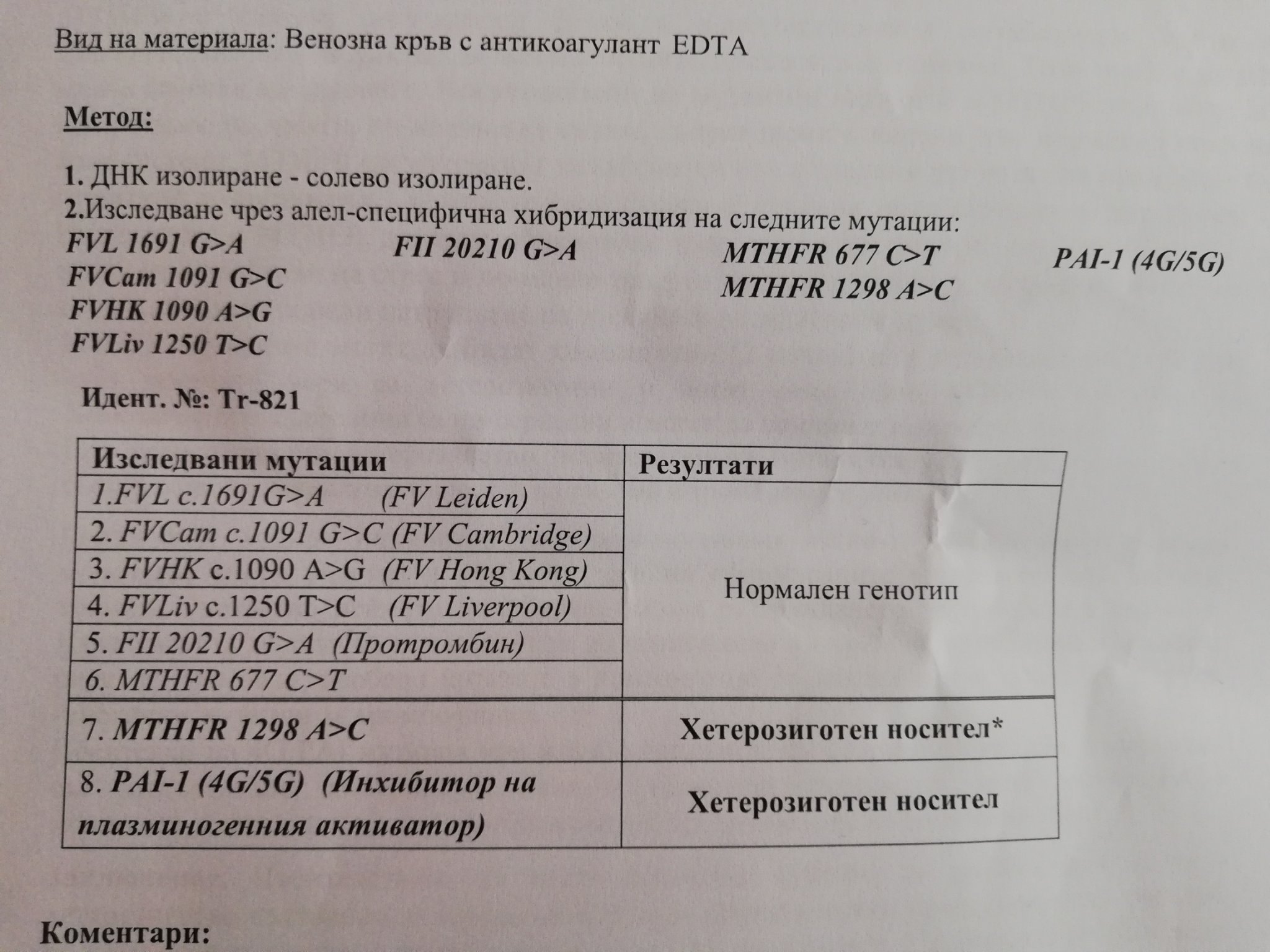 В момента пия натаспин, но ми каза след овулация да го заменя с аспирин протект. За това пуснах изследванията понеже не знам през ден или всеки ден да го пия. Хетерозигот съм ПАИ 4G/5G и хомозигот MTHFR. Живи и здрави следващият месец ще отида до София да пусна фактор 13 и АСЕ.
