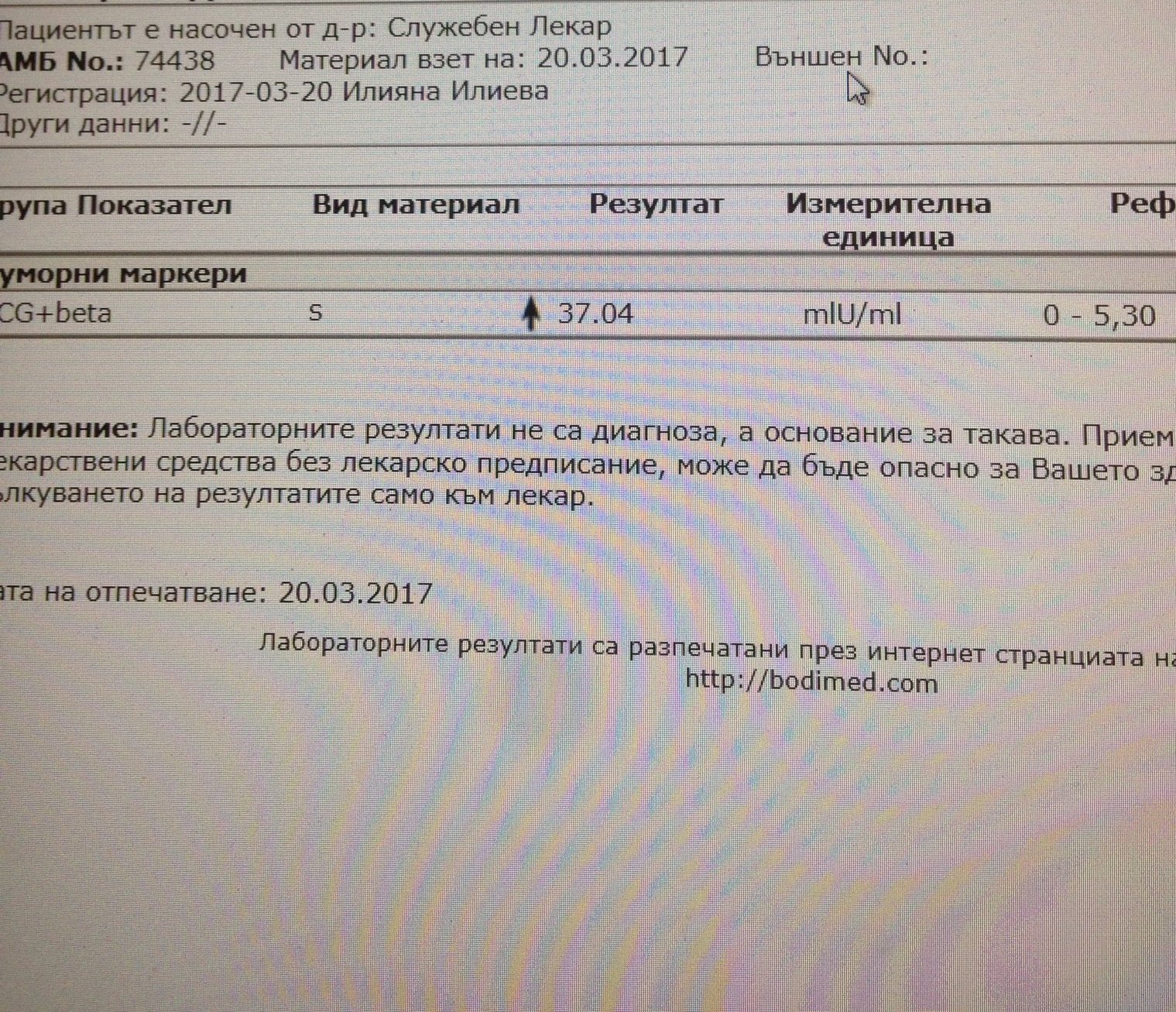 Интересно в каква мерна единица го мерят, че до 1 да е нормата. Можеш ли да го снимаш? Иначе най-добре пак да пуснеш след 48часа, за да видиш дали се удвоява? Ето го моя тест, преди 3г от Бодимед до 5,3 е отрицателен