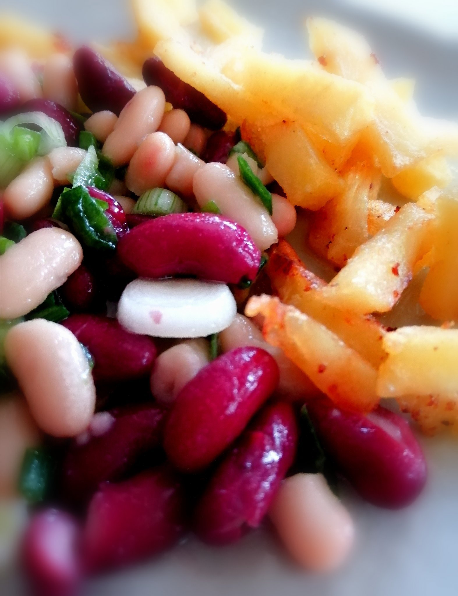 От снощи шарена бобена салата (много хубав боба от Лидъл в консерва, особено червения маслен боб) с пресен лук и пържени картофки и дояждахме пилето и супата от предните дни: