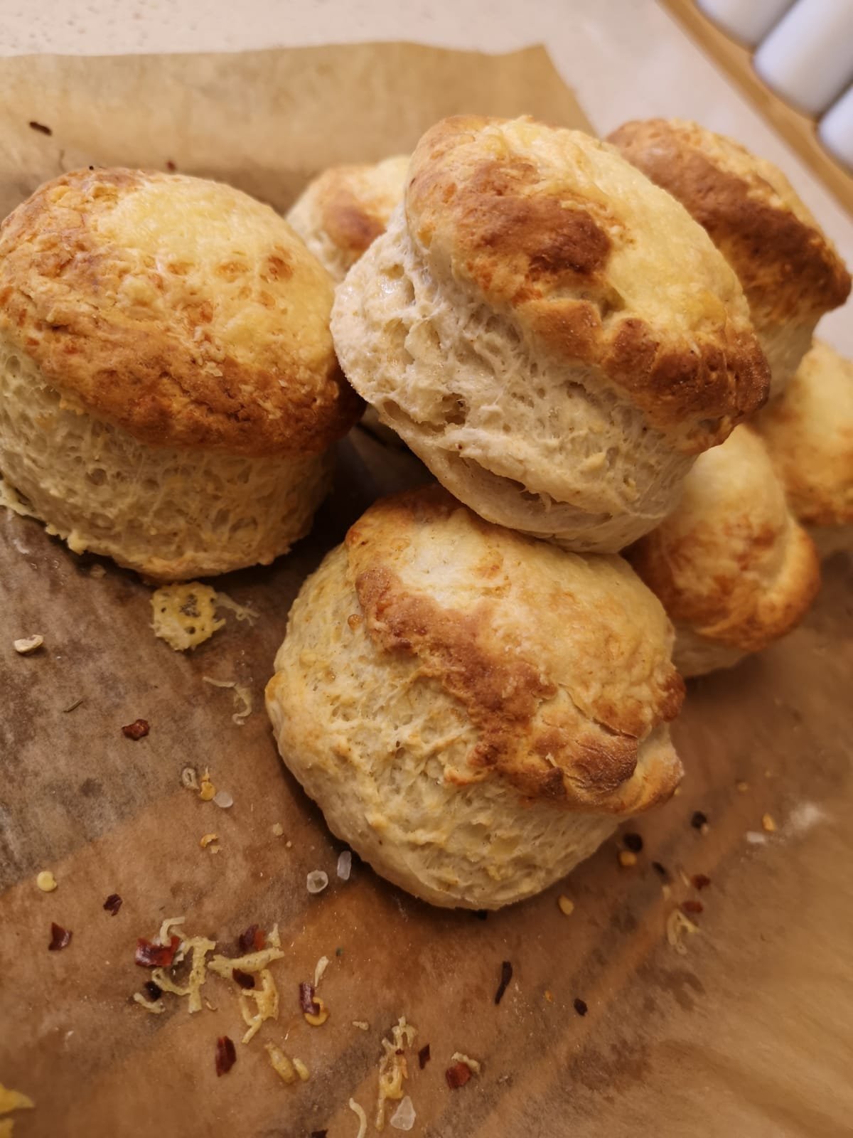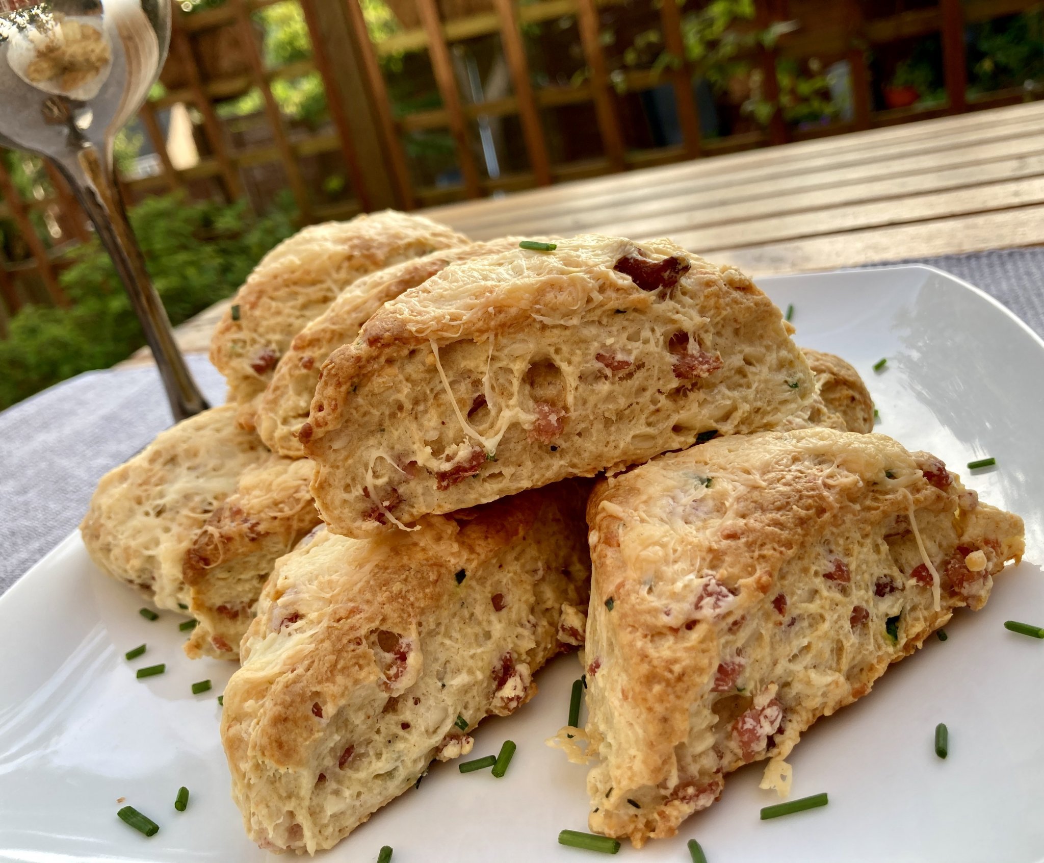 Кашкавалени кифлички (cheese scones) с бекон и лук (chive).