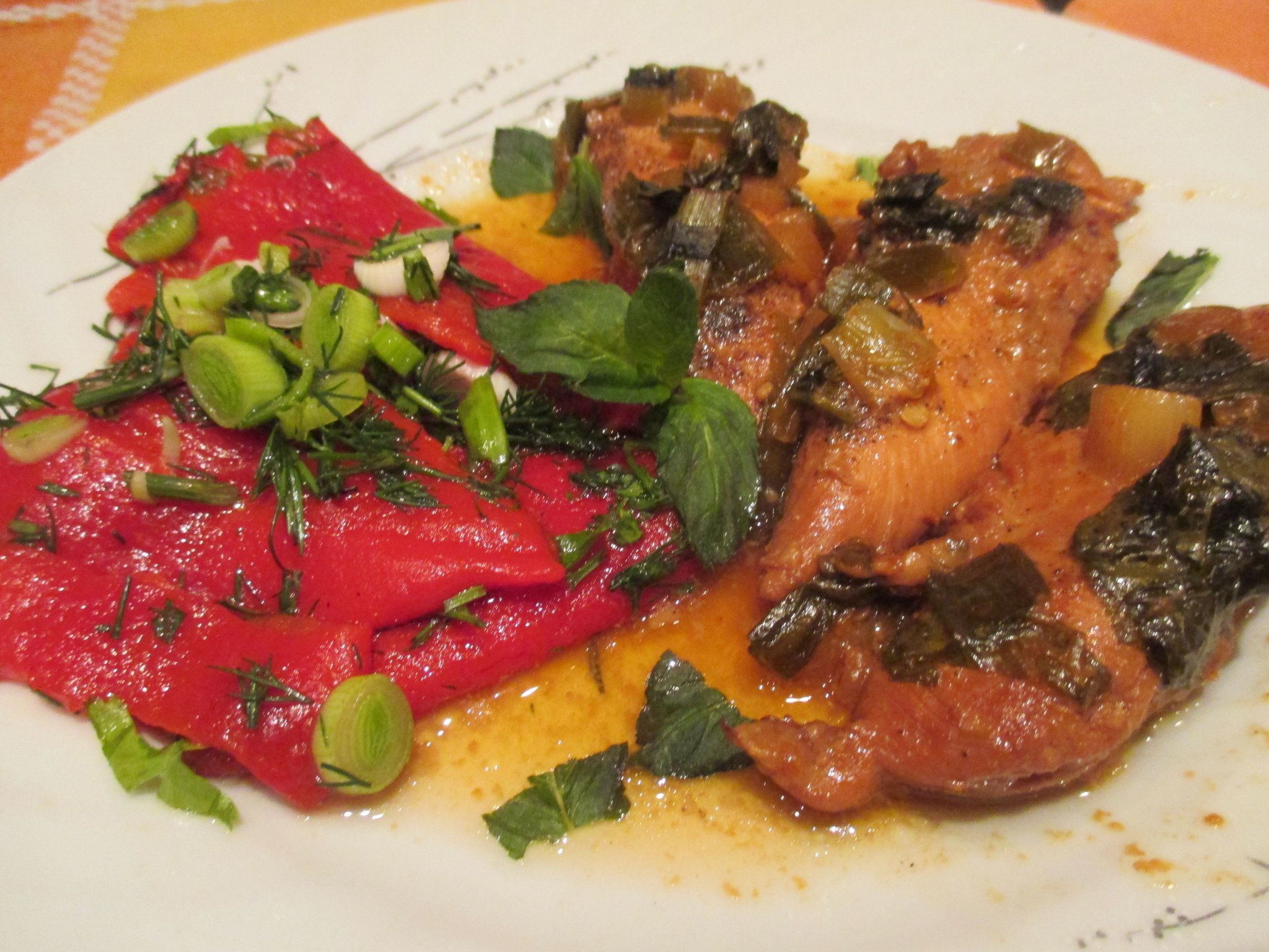 Пилешкото бонфиле беше повечко, така че другата половина мариновано и изпечено на фурна с пресни подправки и зелен чесън.