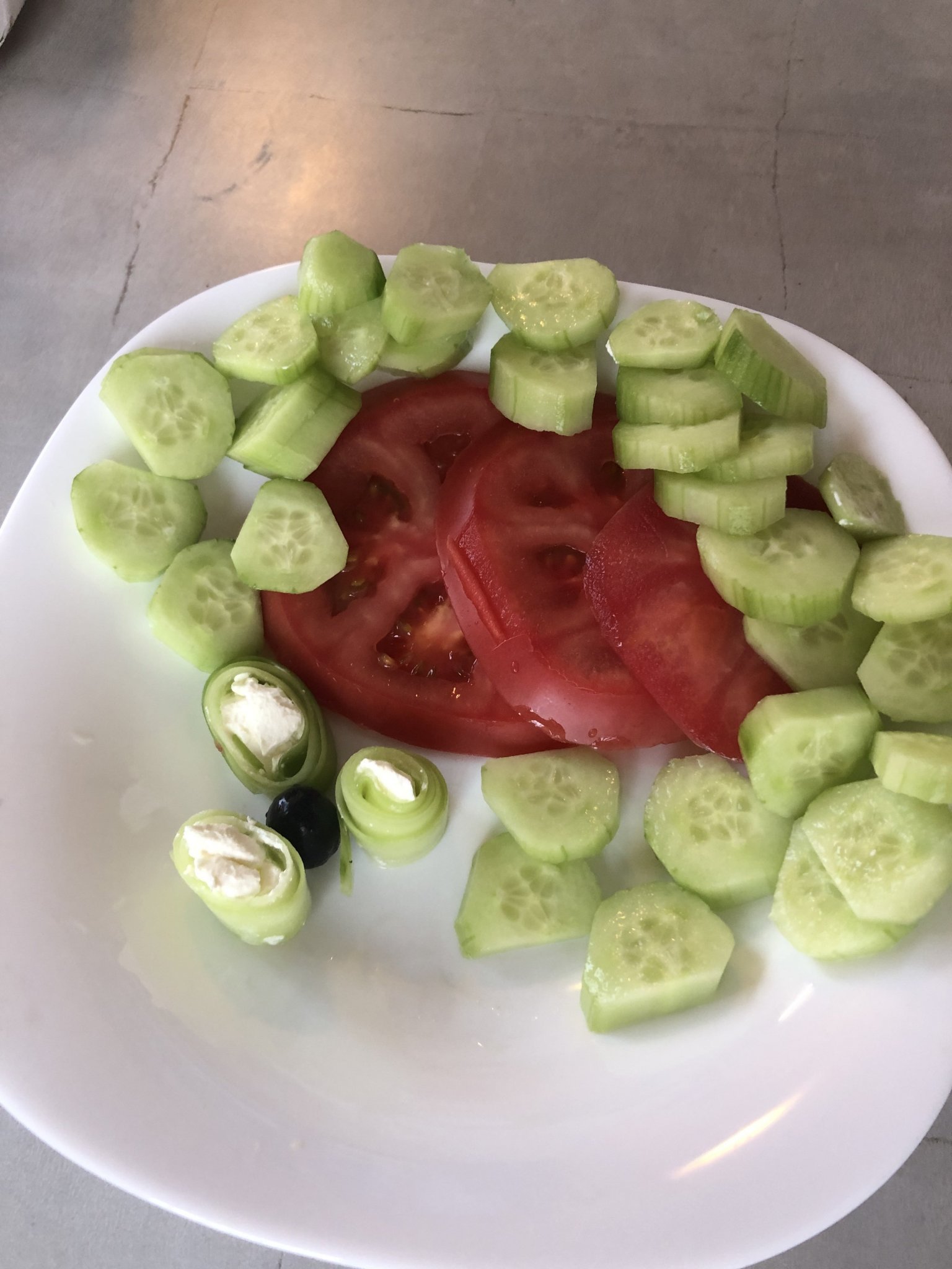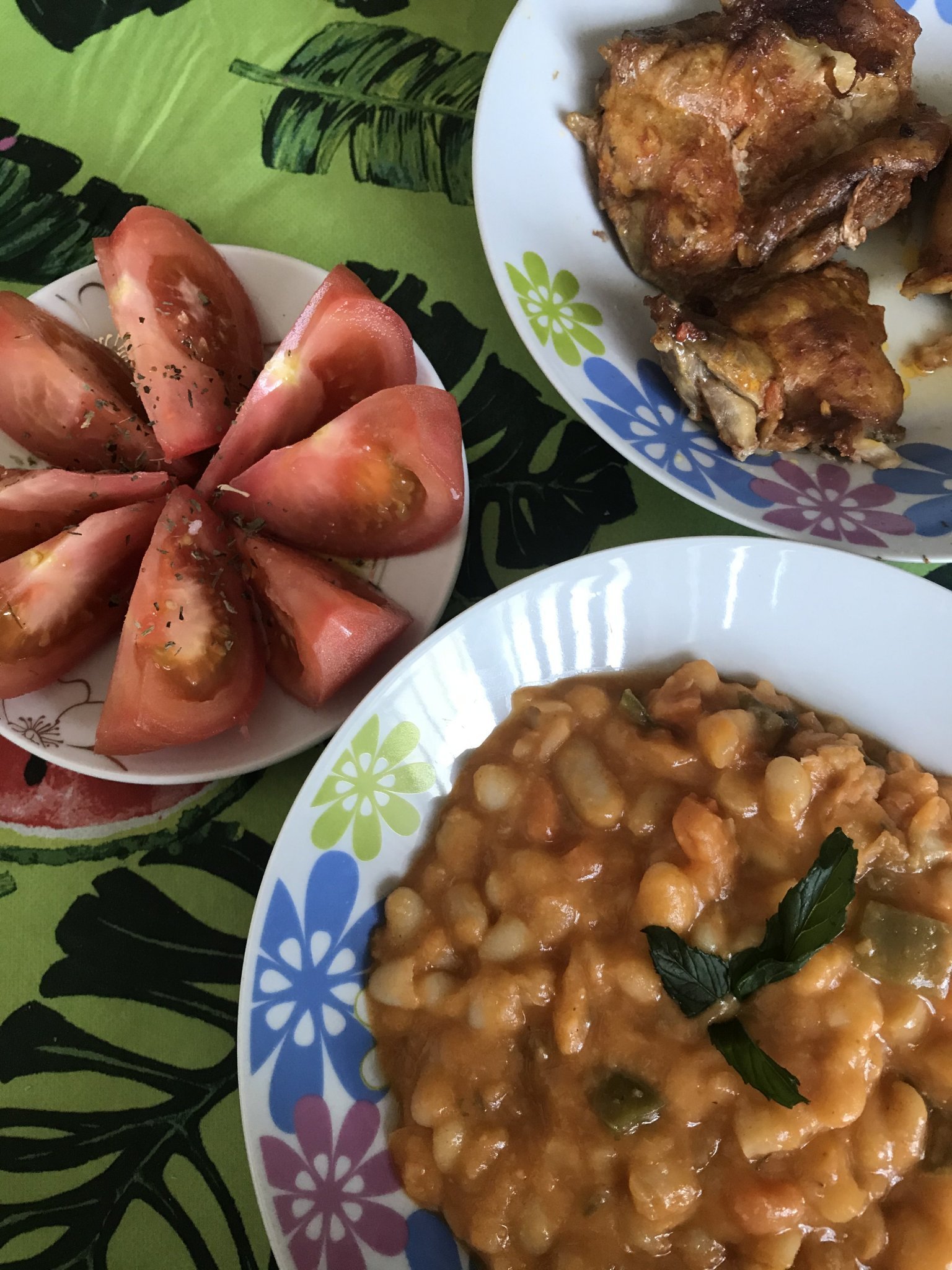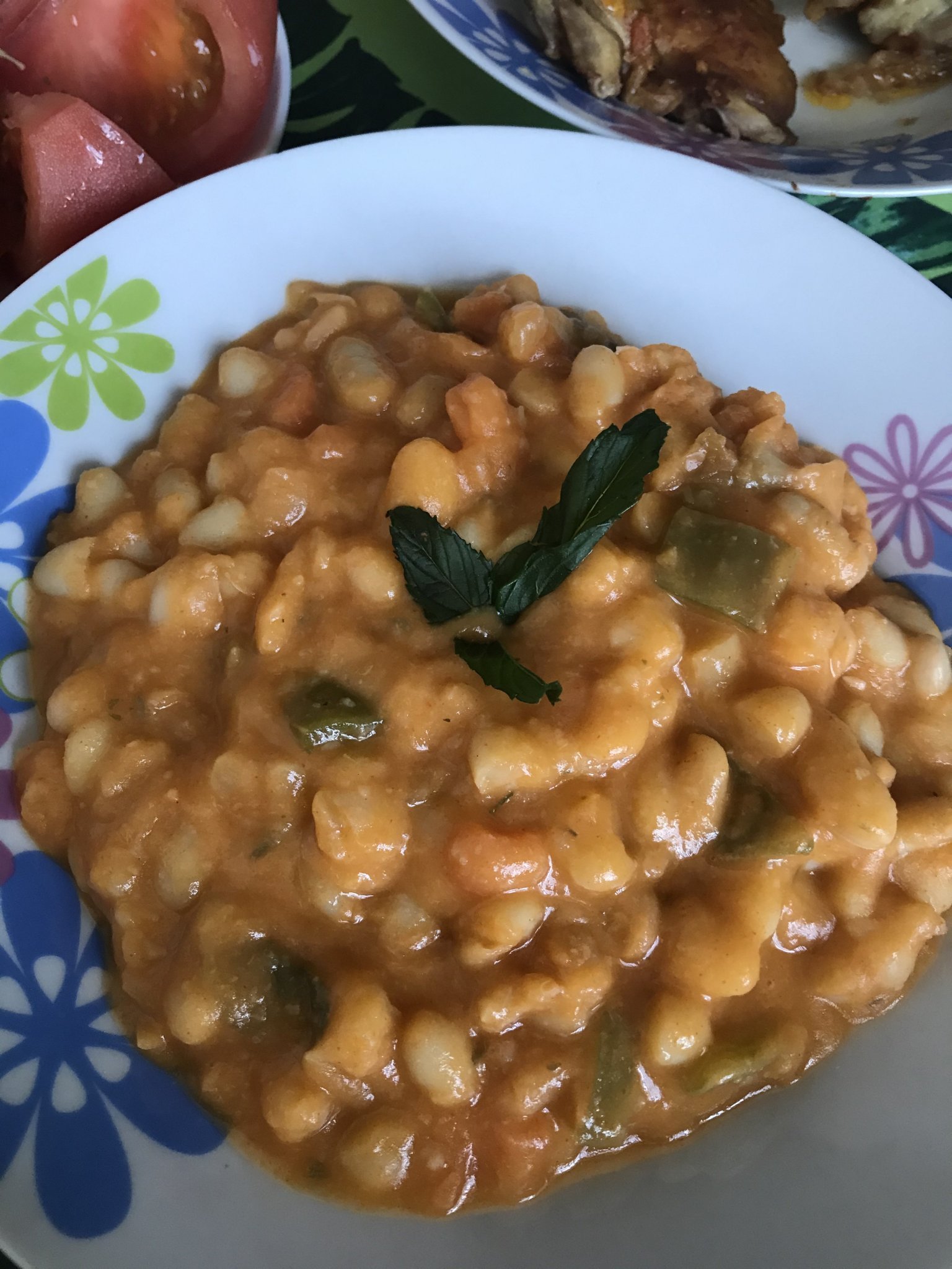 За обяд боб по пеп-4о. Наготвих го снощи, а щерката каза , че ще закусва с него!😁 Много, много вкусен! Към него доматче със зехтин и босилек и пържолки на фурна