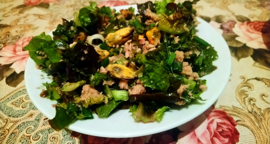 Маруля със зелен лук, миди и риба тон