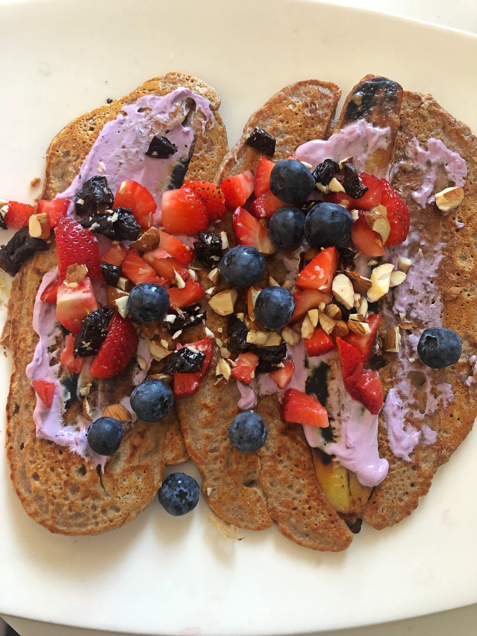Пълнозърнести палачинки с банан,ядки,скир,сушени плодове