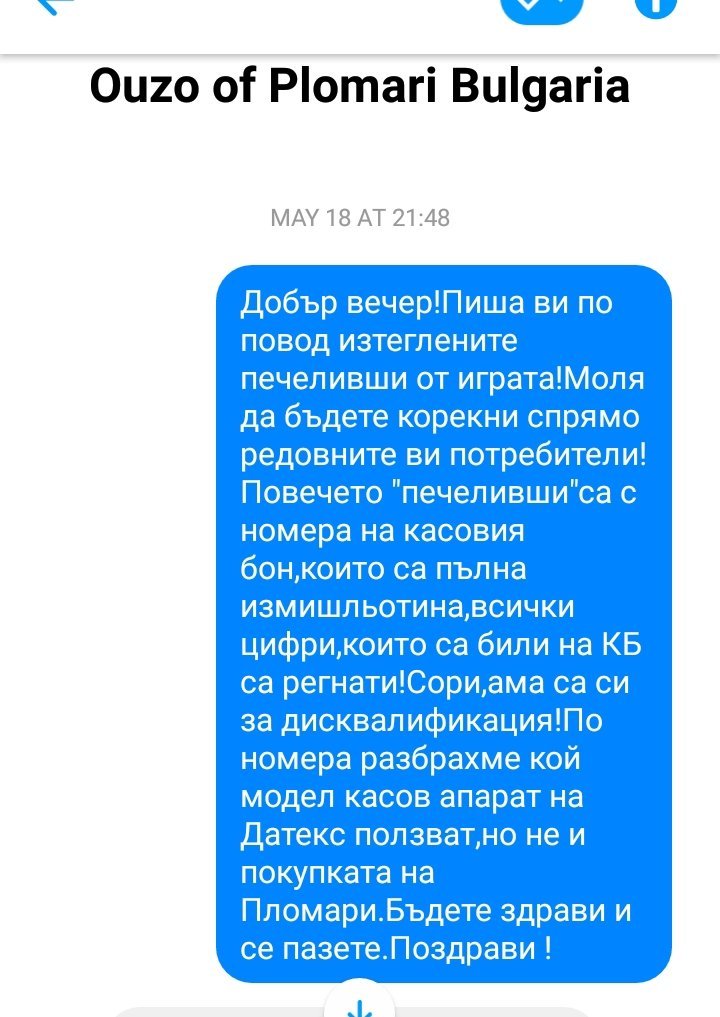 Ма Ко, това за проверка дали една и съща бележка е била регистрирана от няколко различни участници, съм посочила като последна опция за проверка и наистина би било трудно да се направи, макар и не невъзможно. Но другото - да изискат от всеки обявен като печеливш ВСИЧКИ въведени от него бележки за участие, и да ги сравнят помежду им, го считам за напълно постижимо. На първото теглене са били изтеглени около 80-90 участници /мисля, че общият брой награди беше 170 бр., ако не бъркам/. Ако се изиска от всеки печеливш да изпрати снимки на всички регистрирани от него бележки, то те могат да се сравнят от служител на фирмата /не мога да си представя да има участници с много регистрации, все пак това е скъпо питие/ и ако има злоупотреби, много лесно могат да се установят, като се съпоставят с броя записани в системата участия от същото лице. Така веднага ще "лъсне"  ако една и съща бележка да е била регистрирана от участника с пет нейни реквизита, и така са били натрупани изкуствено 5 участия вместо 1... И това да доведе до дисквалификация...