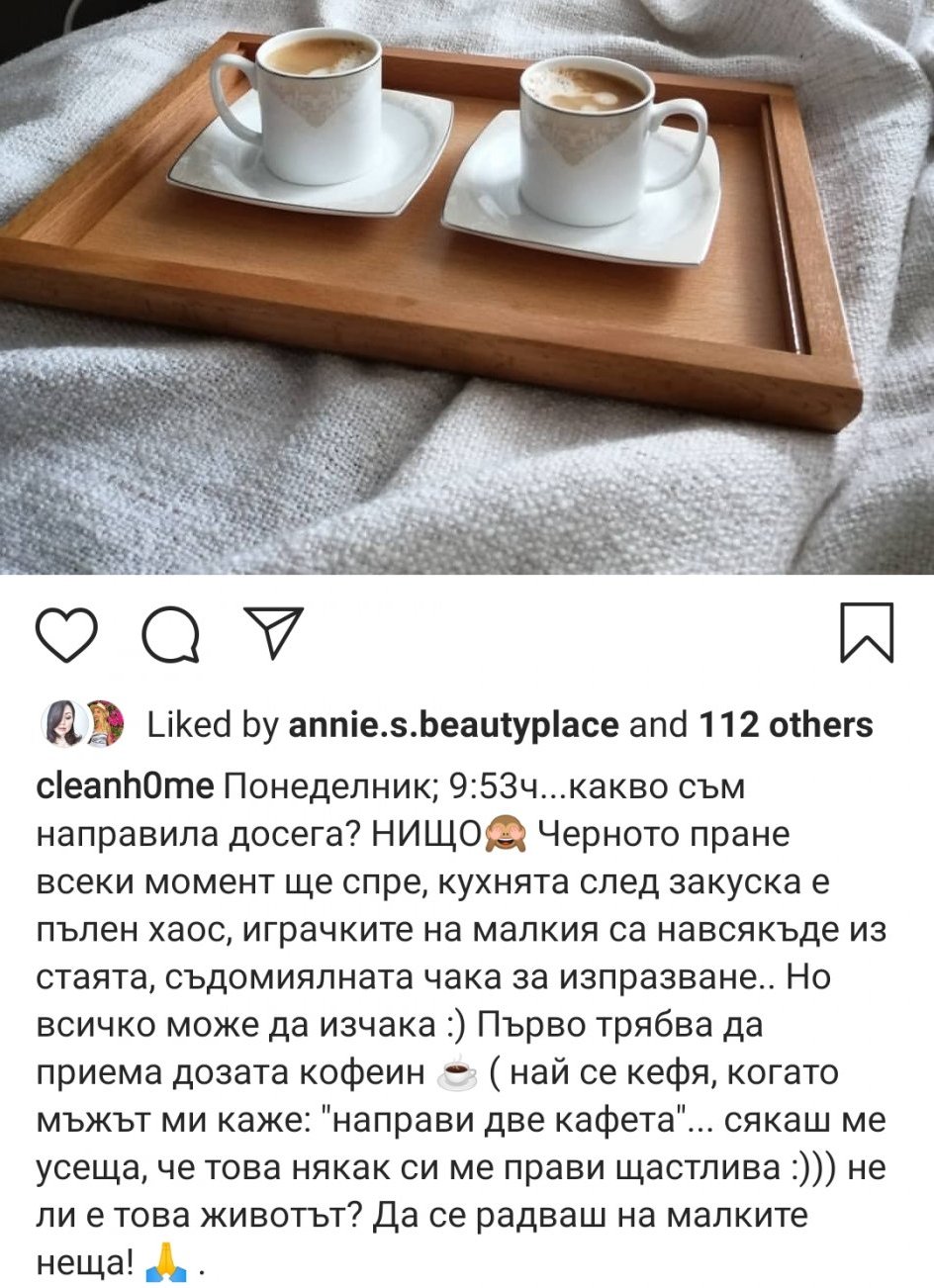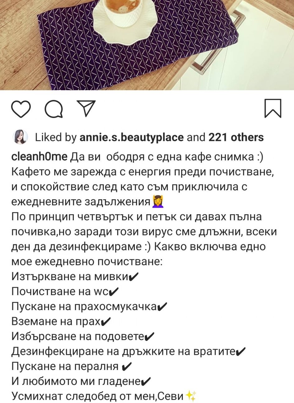 Поради варовита вода аз също съм почиствала мивки всеки ден. Според мен не отнема толкова време нито да се пусне прахосмукачка, нито да се мине пода и праха всеки ден. Когато го изоставиш за 3-4дни става по-трудно и отнема повече време. Фактор е и новото жилище разбира се, по-трудно се почистват по-стари повърхности да речем. А за тоалетната, пак същото. Въпрос на организация, по-добре за по-малко време на ден и някакво вътрешно усещане на спокойствие, отколото насъбрана работа за повече часове/ден. Ама чак инстаграм профил ми е в повече де Sweat Smile