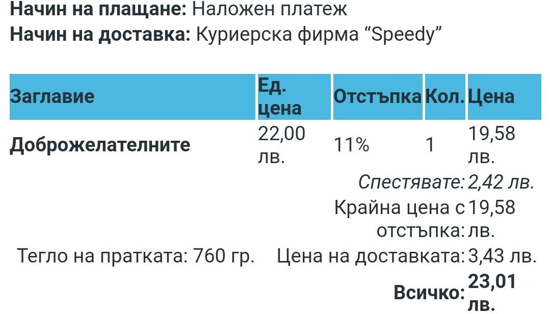 Саня, погледнах  цената на "Доброжелателните" вкъщи  22лв. е била, 6лв. повече е сега.