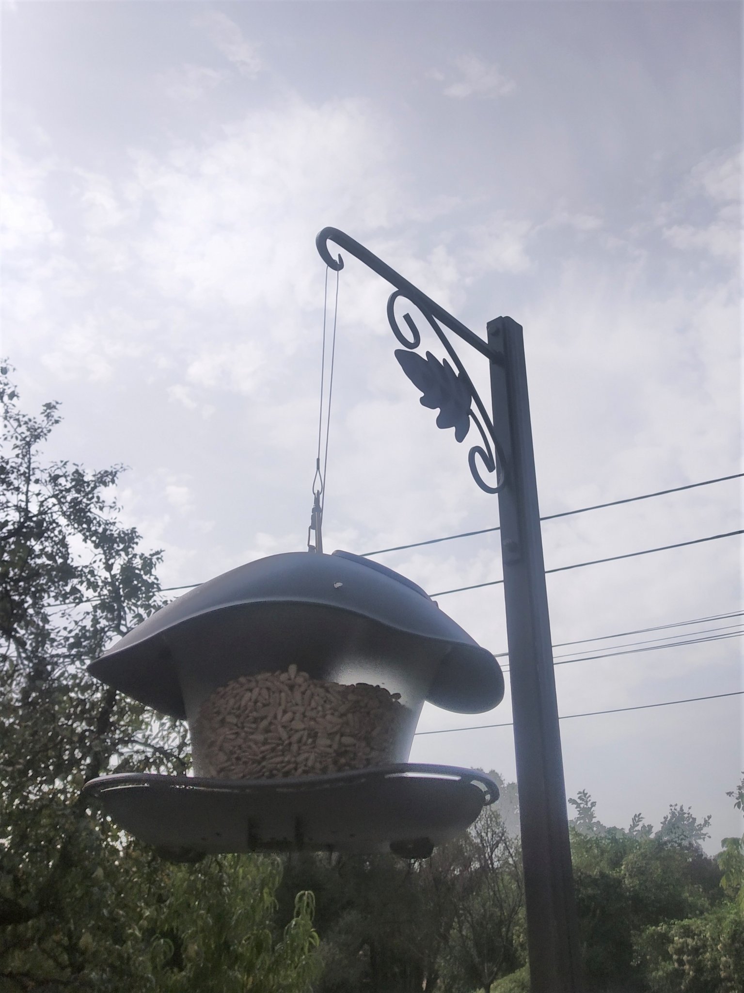 Забелязахме, че след като се нахранят гугутките стоят на хранилката, която е неподвижна върху единия кол на портата и не допускат малките цветни птички. Прочетохме, че за целта се прави втора люлееща се хранилка на поне метър и седемдесет над земята и ето: